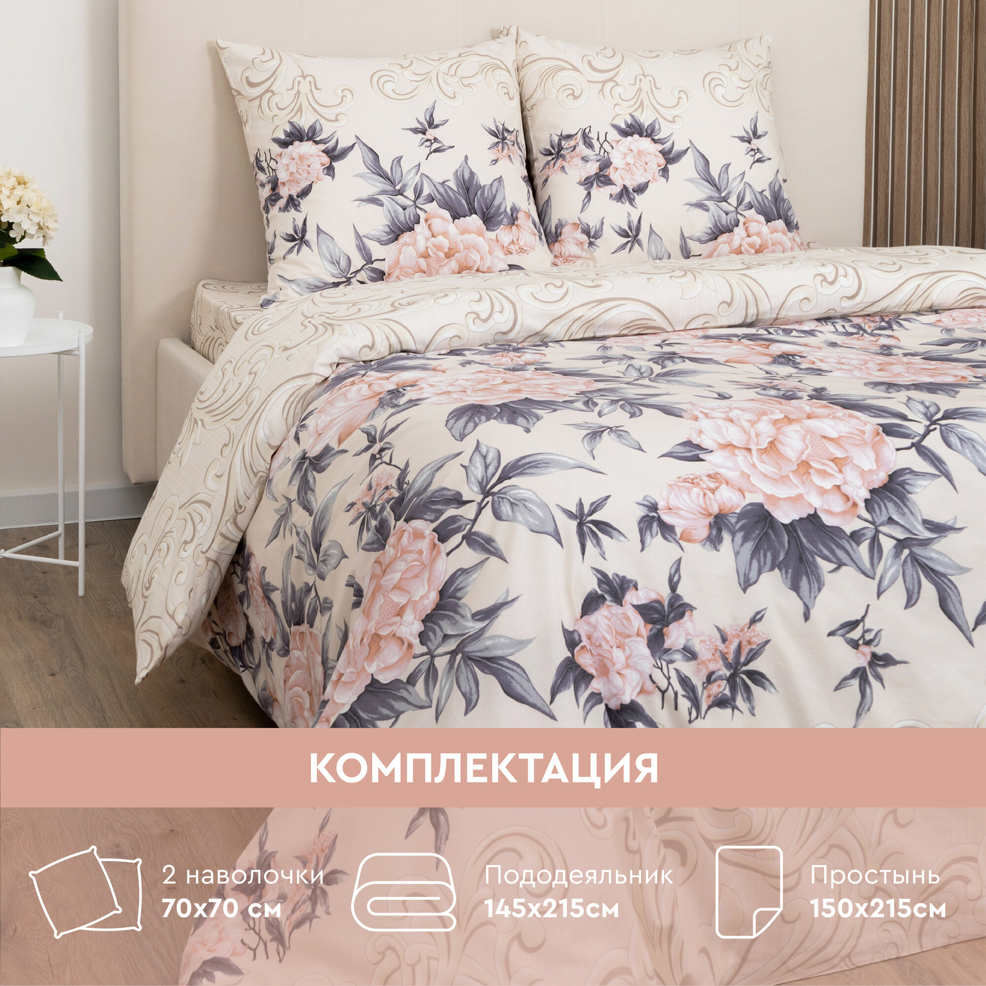 Полутораспальный комплект постельного белья Василиса Пионовый шик из поплина, наволочки 70х70, 11766/1, ТТ-00218141