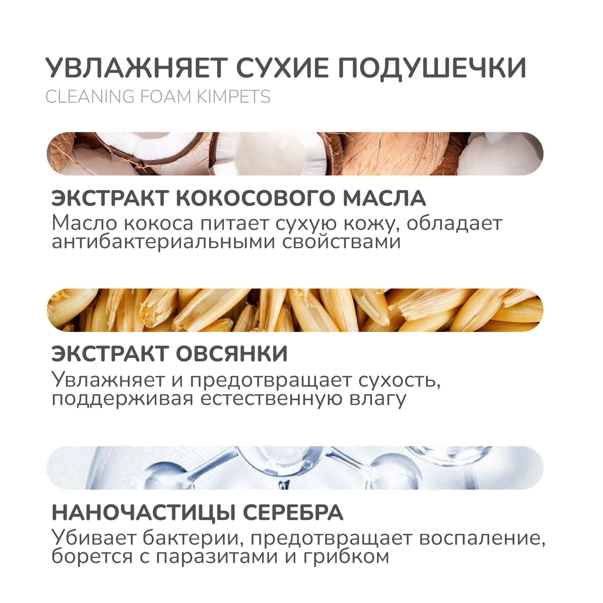 | Состав | Очищенная вода, экстракт кокосового масла, экстракт овсянки, наночастицы ион AG+ |