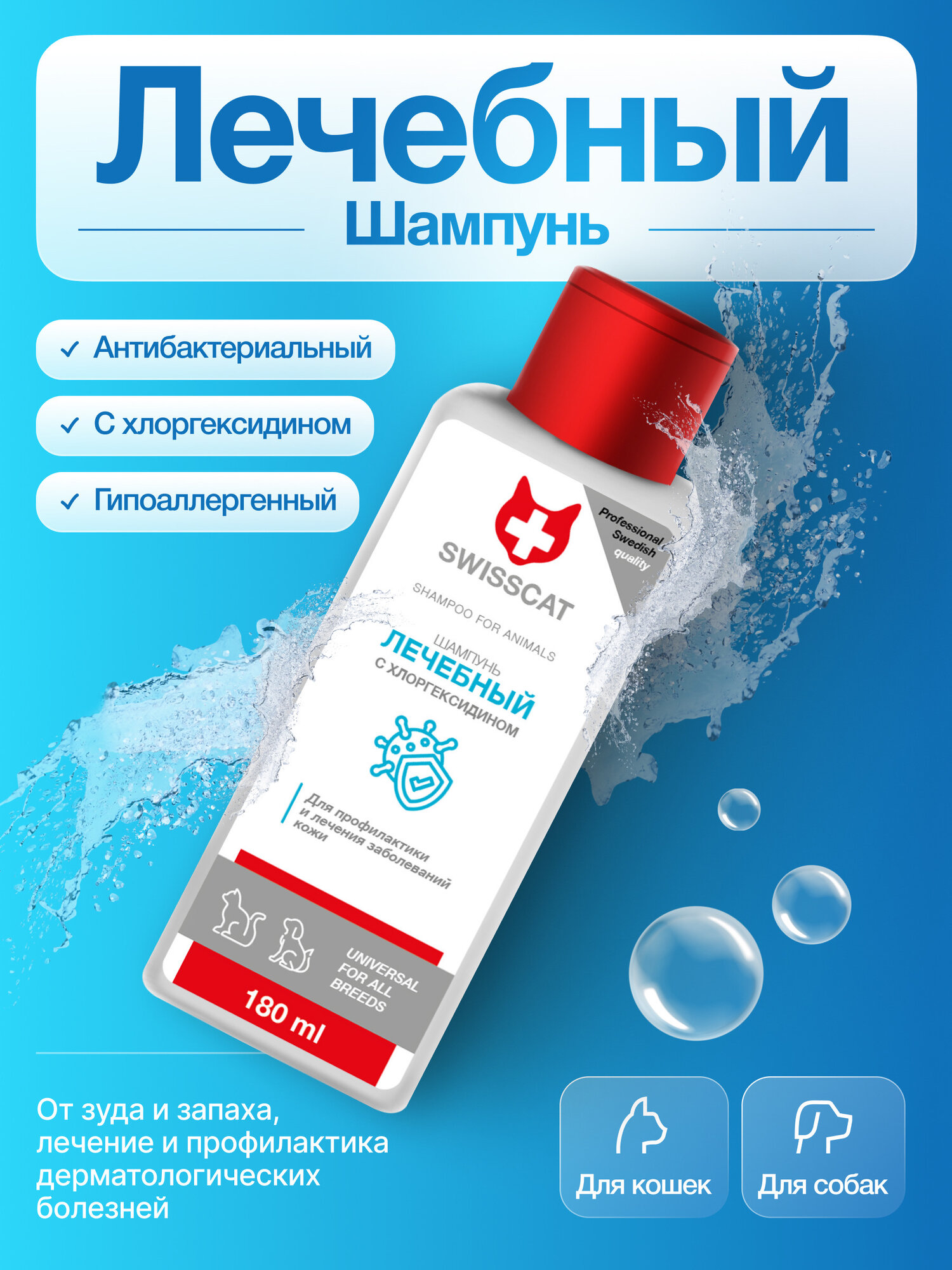 Купить Шампунь для собак и кошек SWISSCAT лечебный с хлоргексидином, антибактериальный, против зуда и запаха, 180 мл
