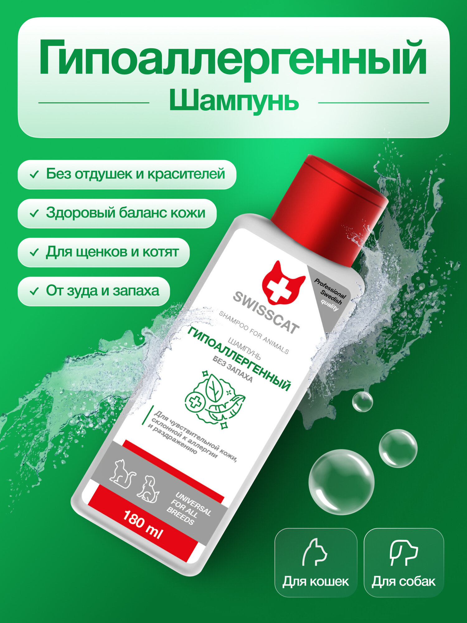 Купить Шампунь для собак и кошек SWISSCAT гипоаллергенный с хлоргексидином, антибактериальный, против запаха, 180 мл