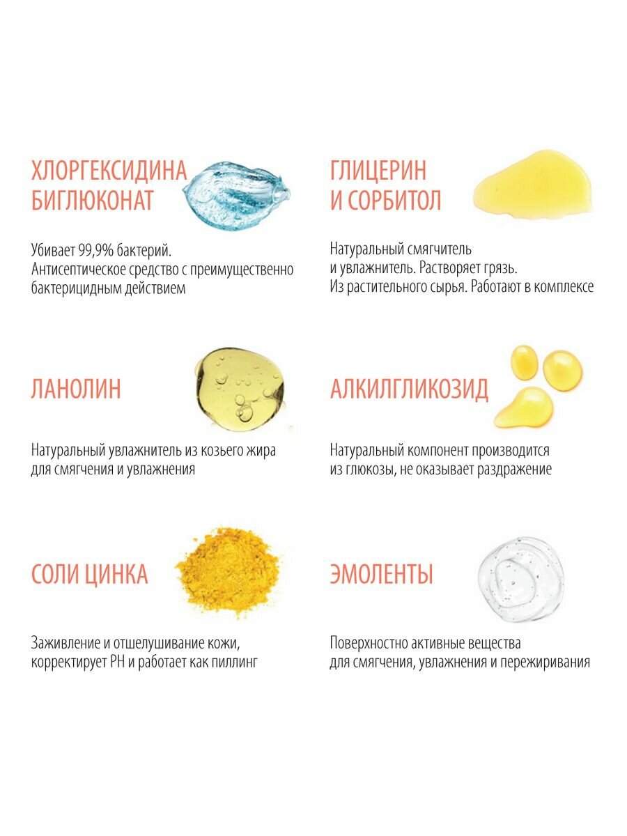 | Состав | глицерин 5%, ланолин 6%, алкилогликозид 15%, соль 5%, хлоргексидина биглюконат 1%, подготовленная вода 63%, эмолент 5% |