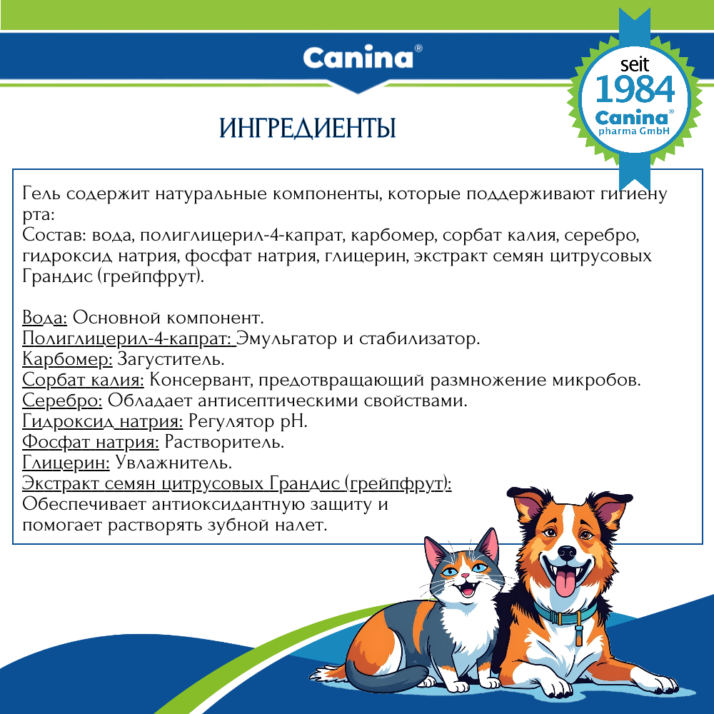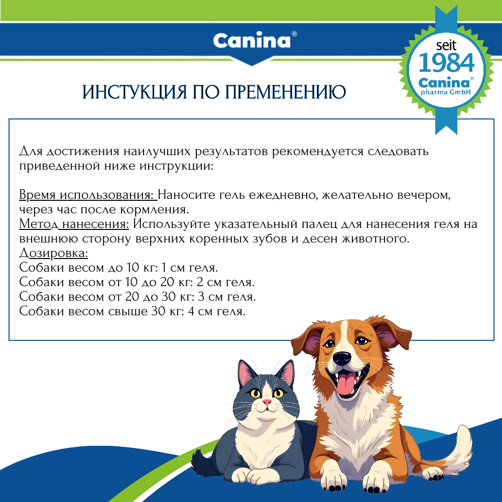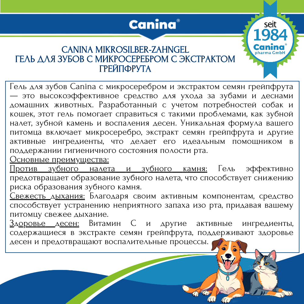 | Дополнительная информация | Не все животные терпимо относятся к манипуляциям во рту. Перед тем как начинать очистку десен и зубов с гелем, стоит приучить питомца к спокойной реакции на палец человека во рту. Начинайте с подъема верхней губы и аккуратных поступательных движений пальцем по деснам. Когда кошка или собака спокойно выносят эту процедуру, можно приступать к нанесению Canina Mikrosilber Zahngel. |