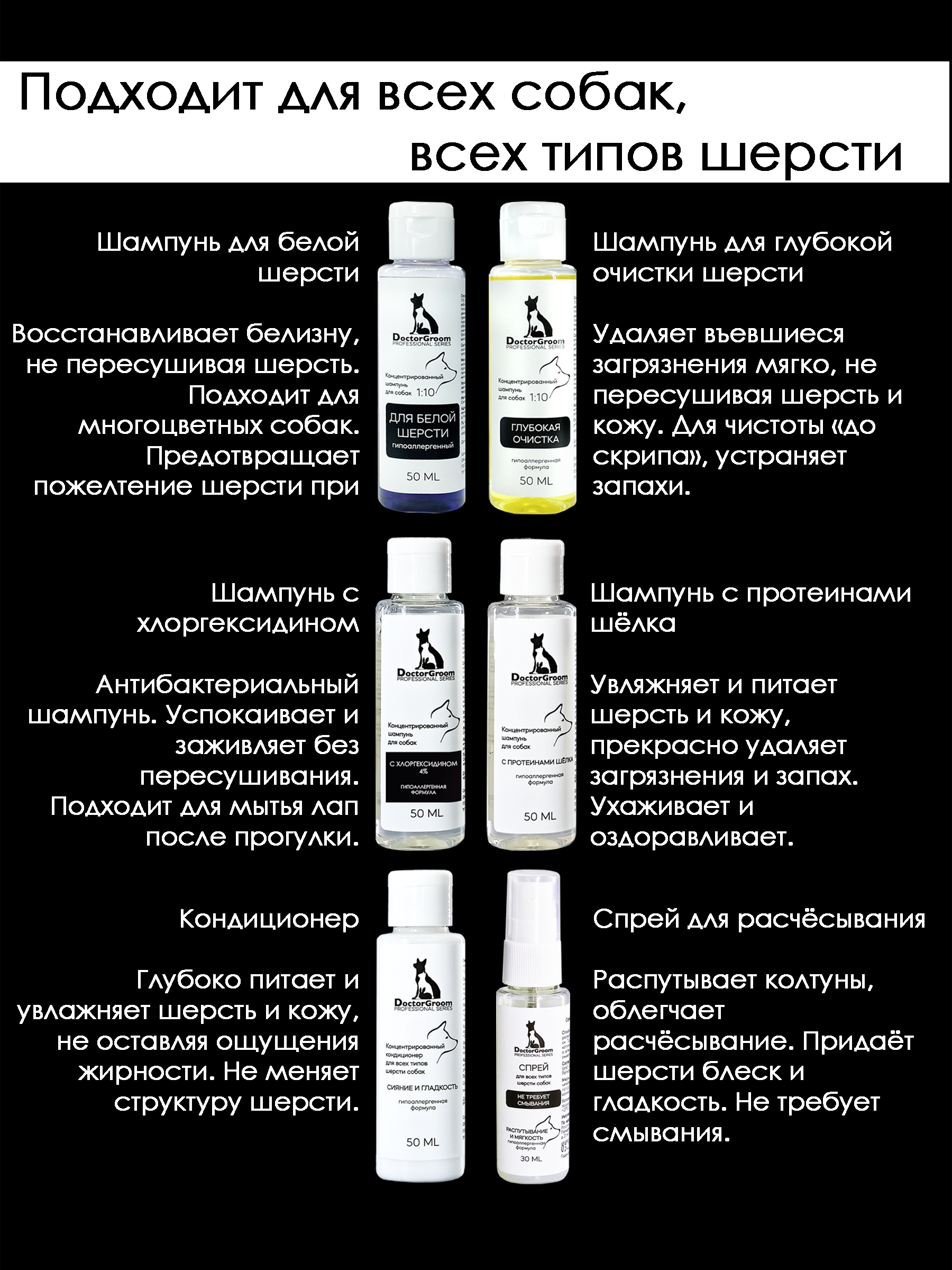 | Подробная комплектация | Шампунь с протеинами шелка 50мл 1шт., шампунь с хлоргексидином 50мл 1 шт., шампунь для белой шерсти 50мл 1 шт., шампунь для глубокого очищения 50мл 1 шт., кондиционер для шерсти 50мл 1шт., спрей для шерсти от колтунов 30мл 1 шт. |