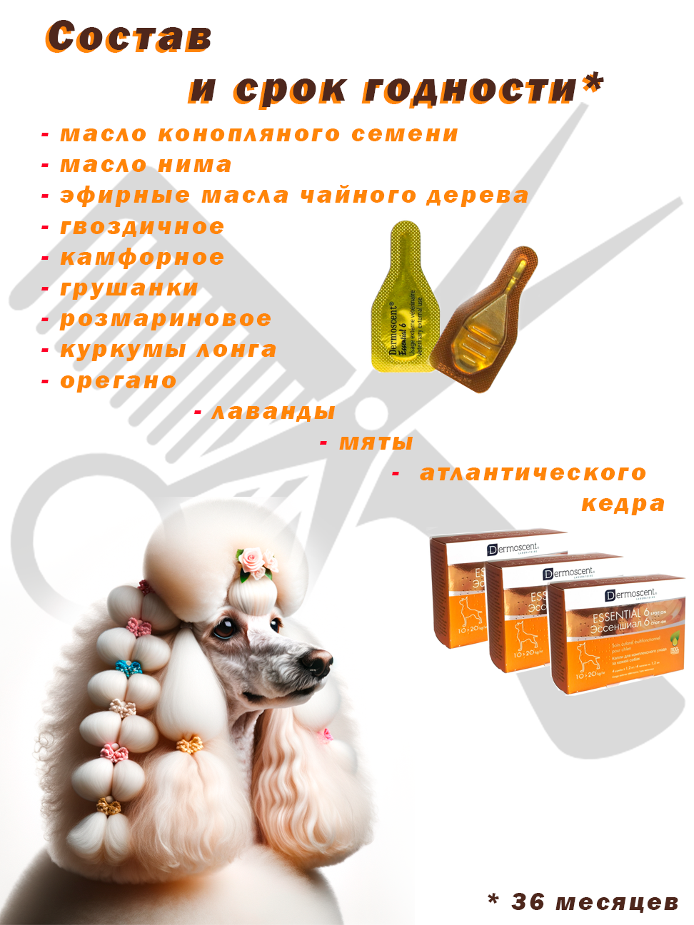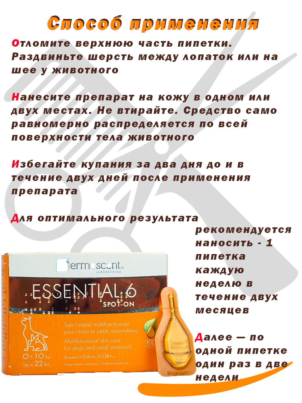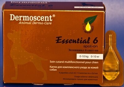 | Дополнительная информация | Эссеншиал 6 спот-он рекомендован при следующих нарушениях: сухая кожа, жирная кожа, раздражение, покраснение кожи, выпадение шерсти, блеклая/ломкая шерсть и неприятный запах; подходит для любого типа кожи и всех видов шерстного покрова. Снижает частоту применения шампуня и восполняет ежедневную потребность в незаменимых жирных кислотах (6-3); протестировано ветеринарными врачами |