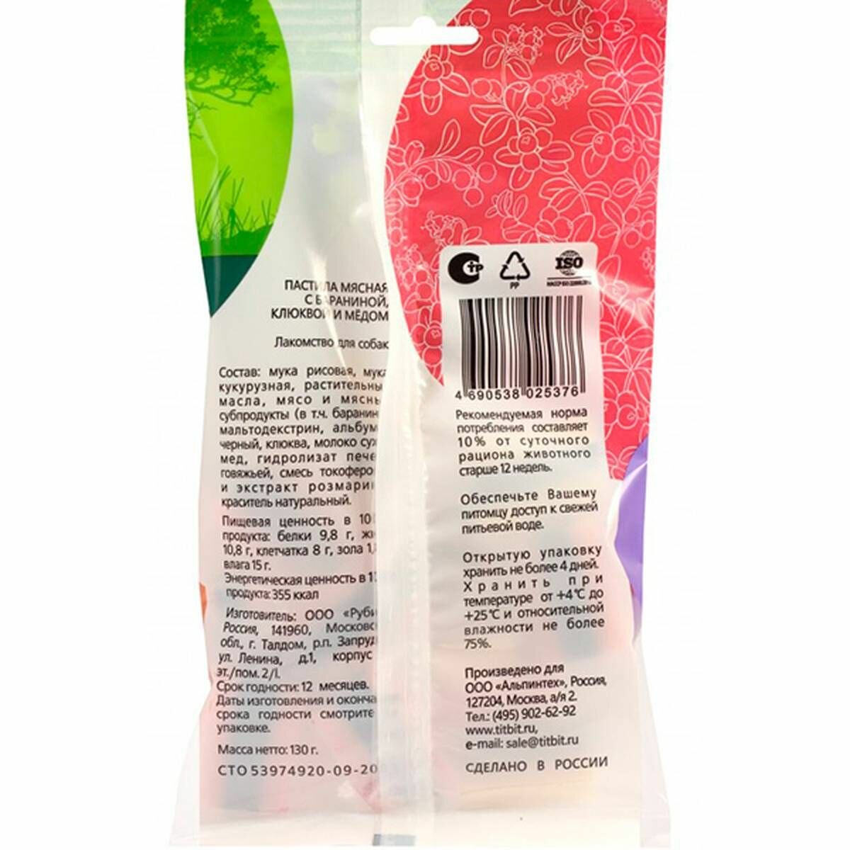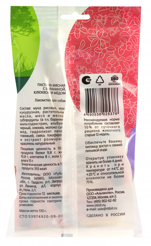 Лакомство для собак TiTBiT Пастила мясная с бараниной клюквой и медом 130 г. интересное: