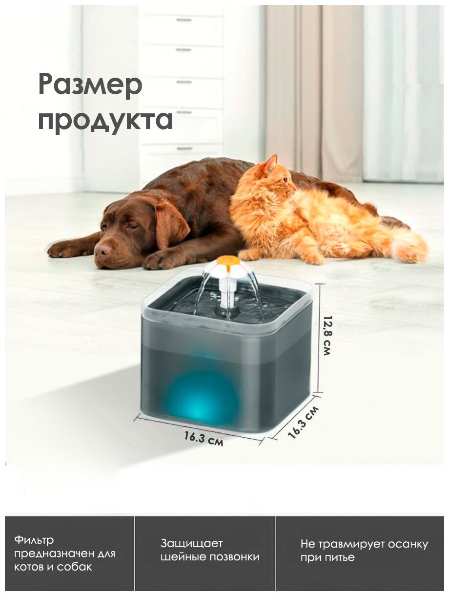 | Подробная комплектация | поилка фонтан для кошек, собак, грызунов - 1 шт., моторчик насос - 1 шт, USB провод - 1 шт., коробка - 1 шт., угольный фильтр - 2 шт., губчатый фильтр - 1 шт., отсек для фильтра - 1 шт., инструкция - 1 шт. |