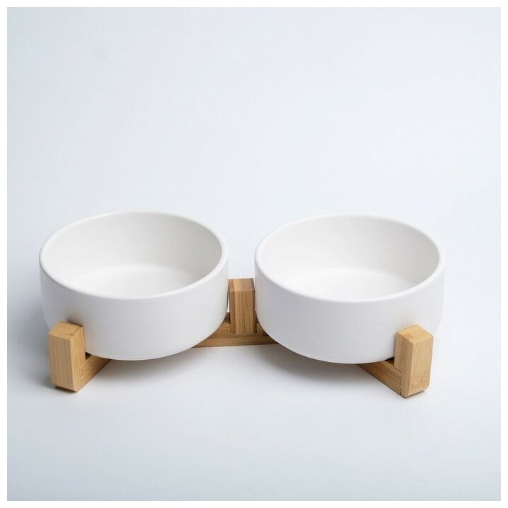 Миски керамические для кошек и собак на деревянной подставке, 2 шт, 400мл,цвет бело-серый
