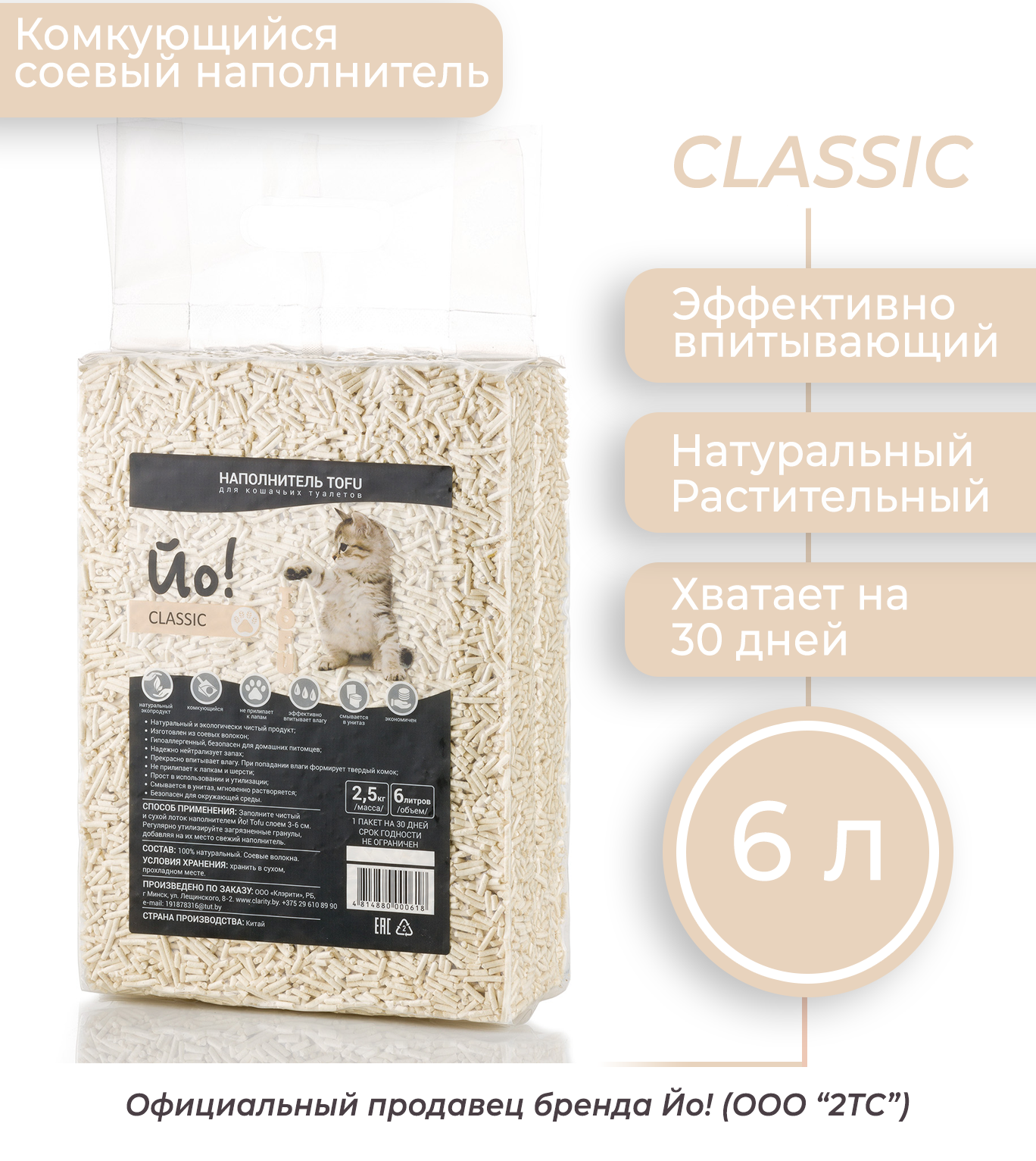 Купить Комкующийся соевый наполнитель для кошачьего туалета Йо! Tofu классик, 6 литров
