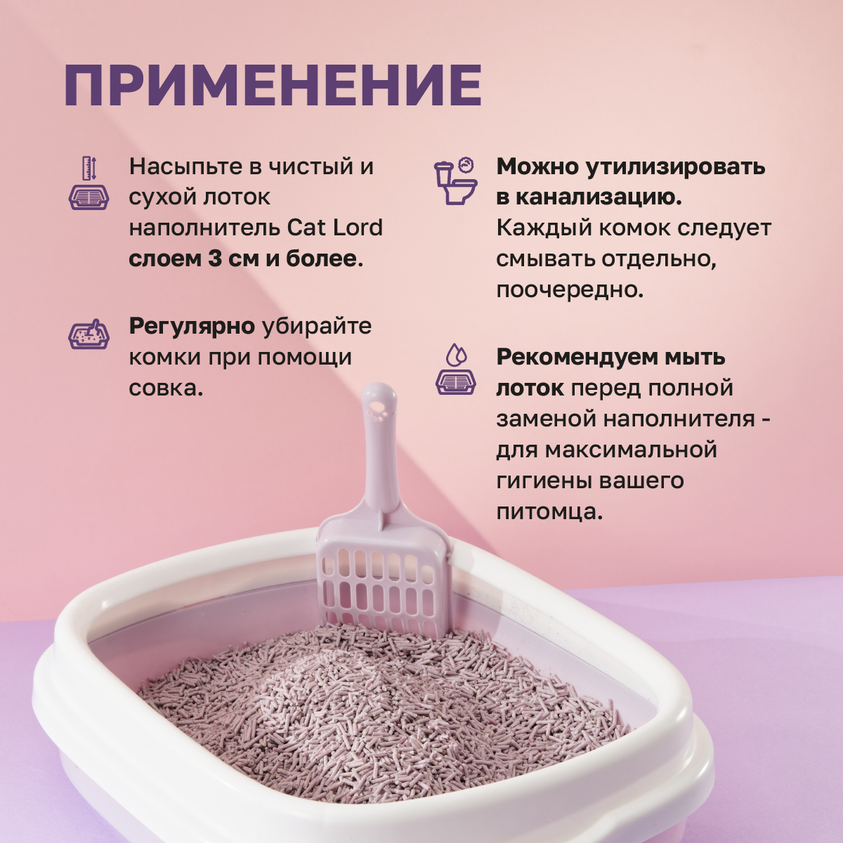 | Особенности | ароматизированный / биоразлагаемый / возможность утилизации в канализации / гранулированный / для длинношерстных / для котят / контроль запаха / с защитой от запаха / смываемый |