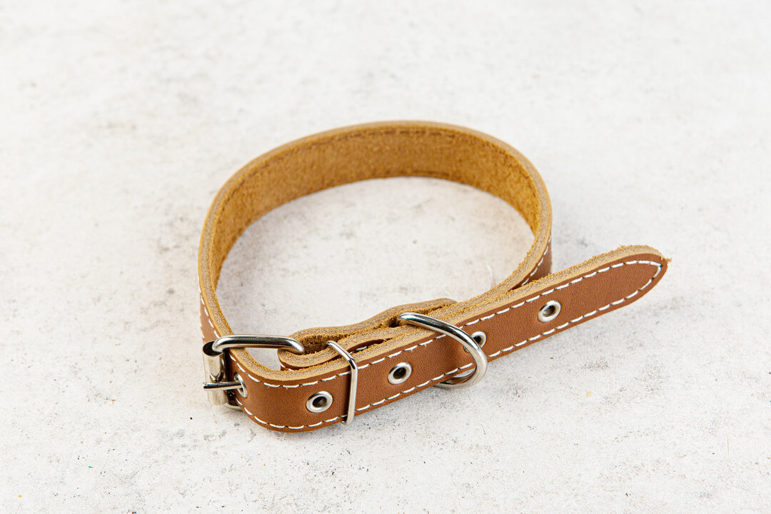 Ошейник Homepet кожаный, простой двойной, простроченный двухслойный, коричневый 20 мм 32-42 см
