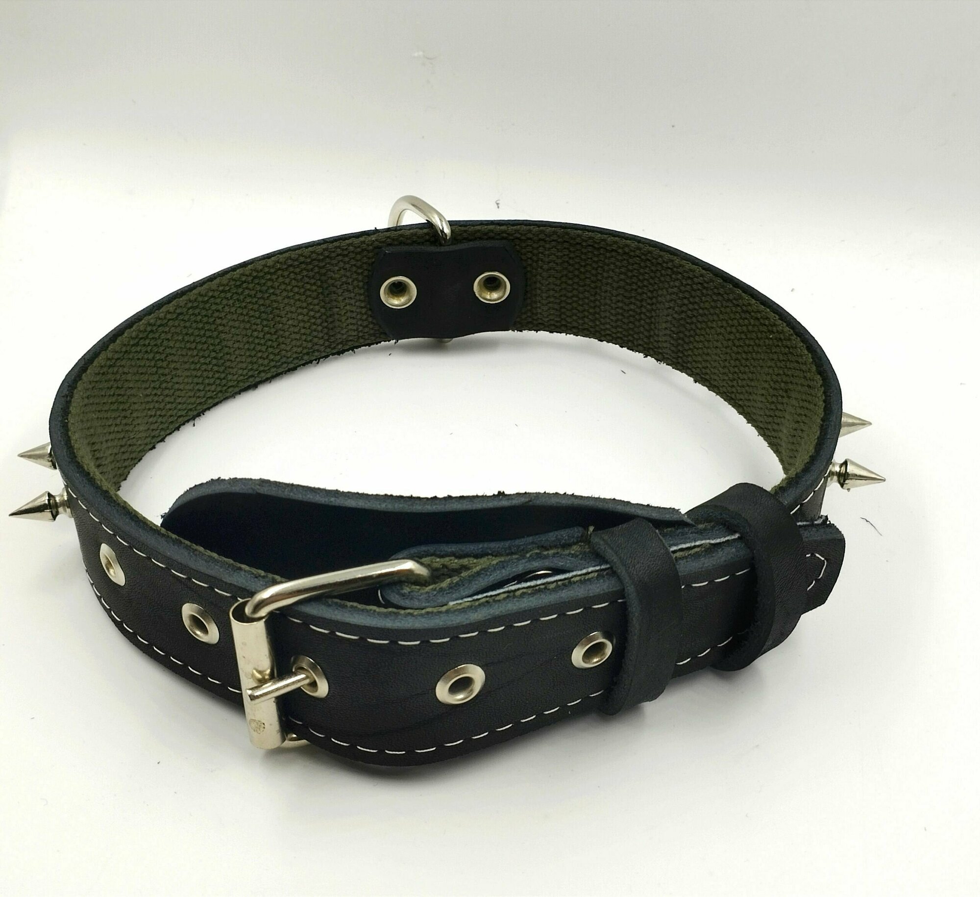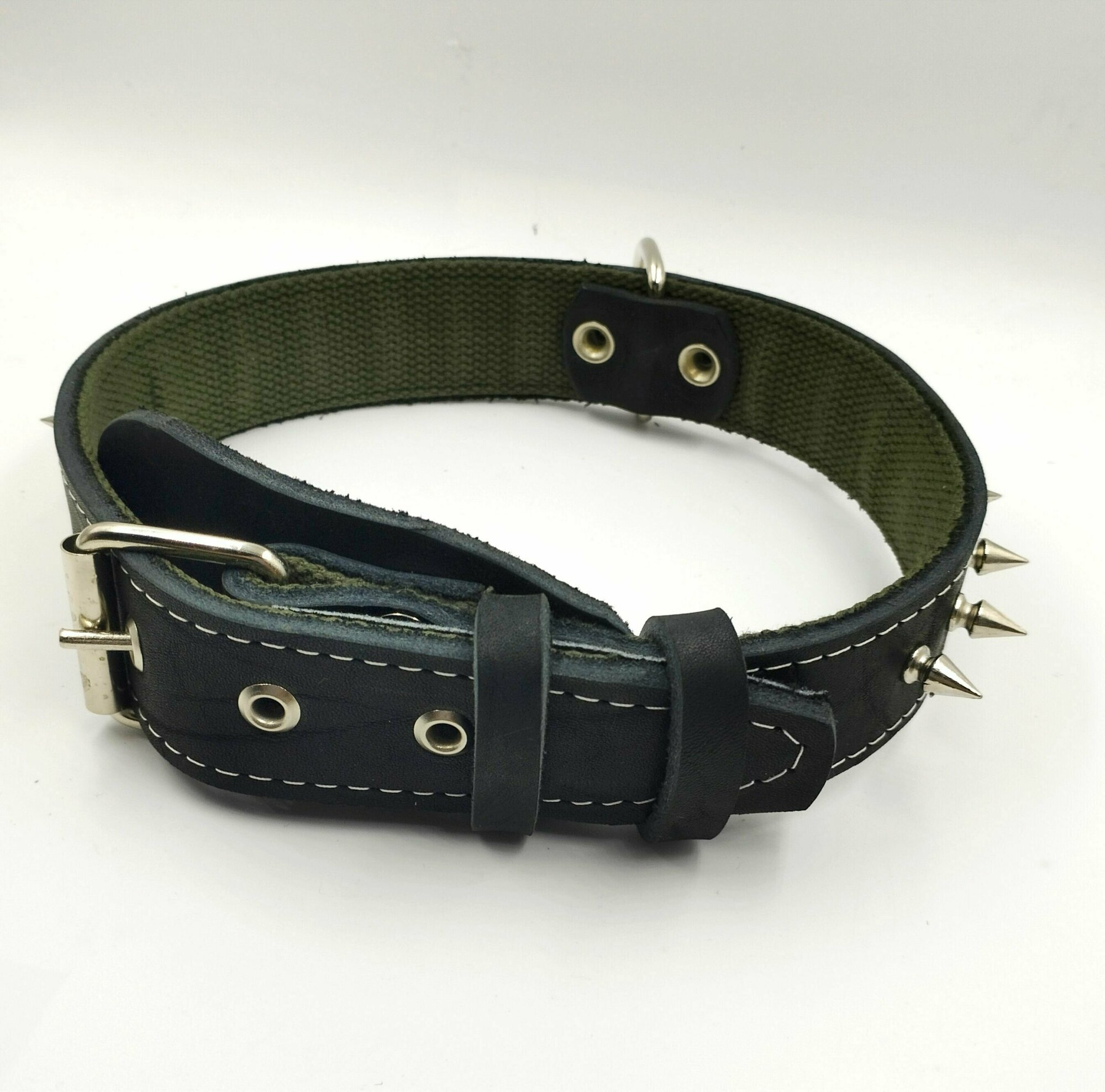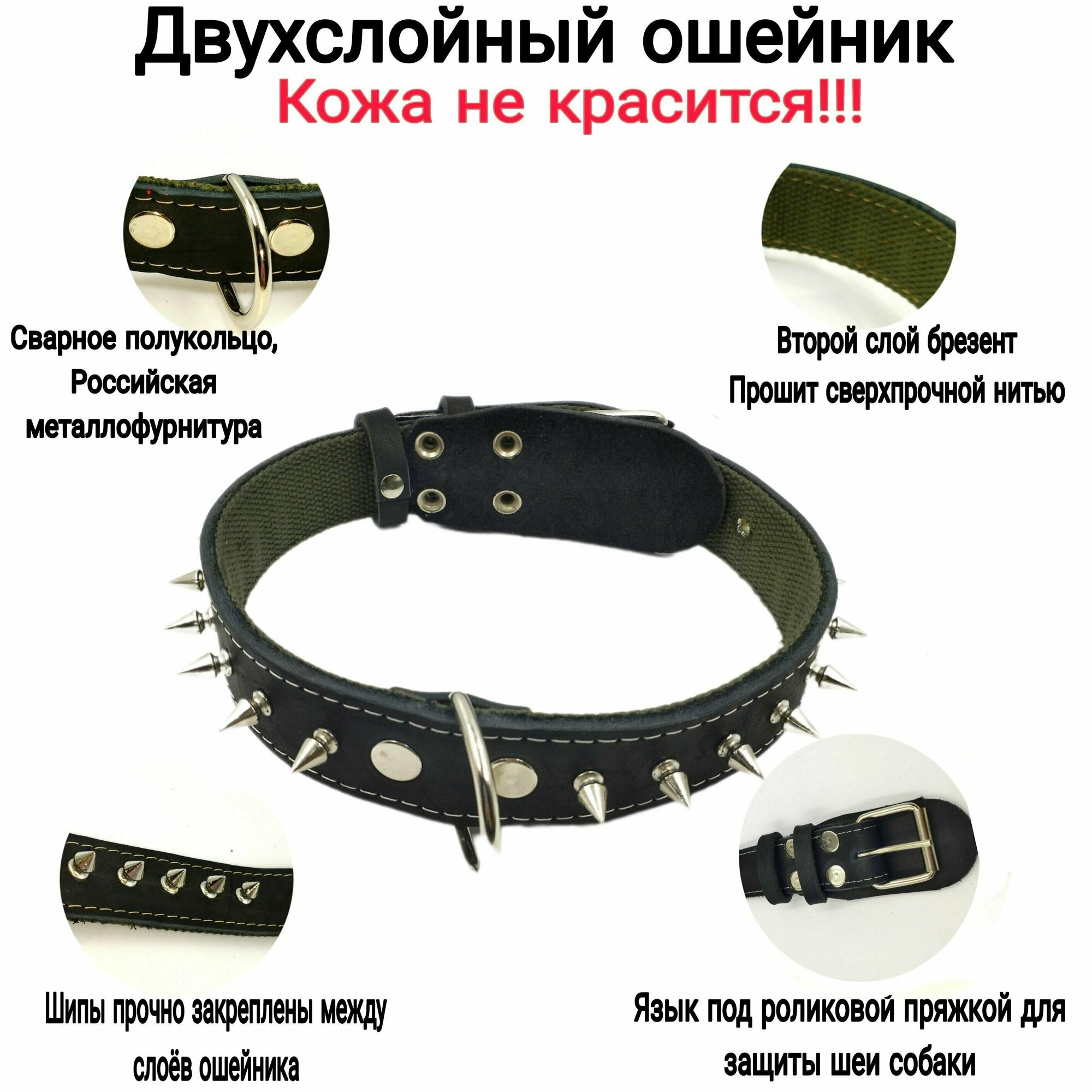 Ошейник для средних пород собак из натуральной кожи и брезента с шипами, ширина 45 мм, длина 66 см, объём шеи 45-57 см.