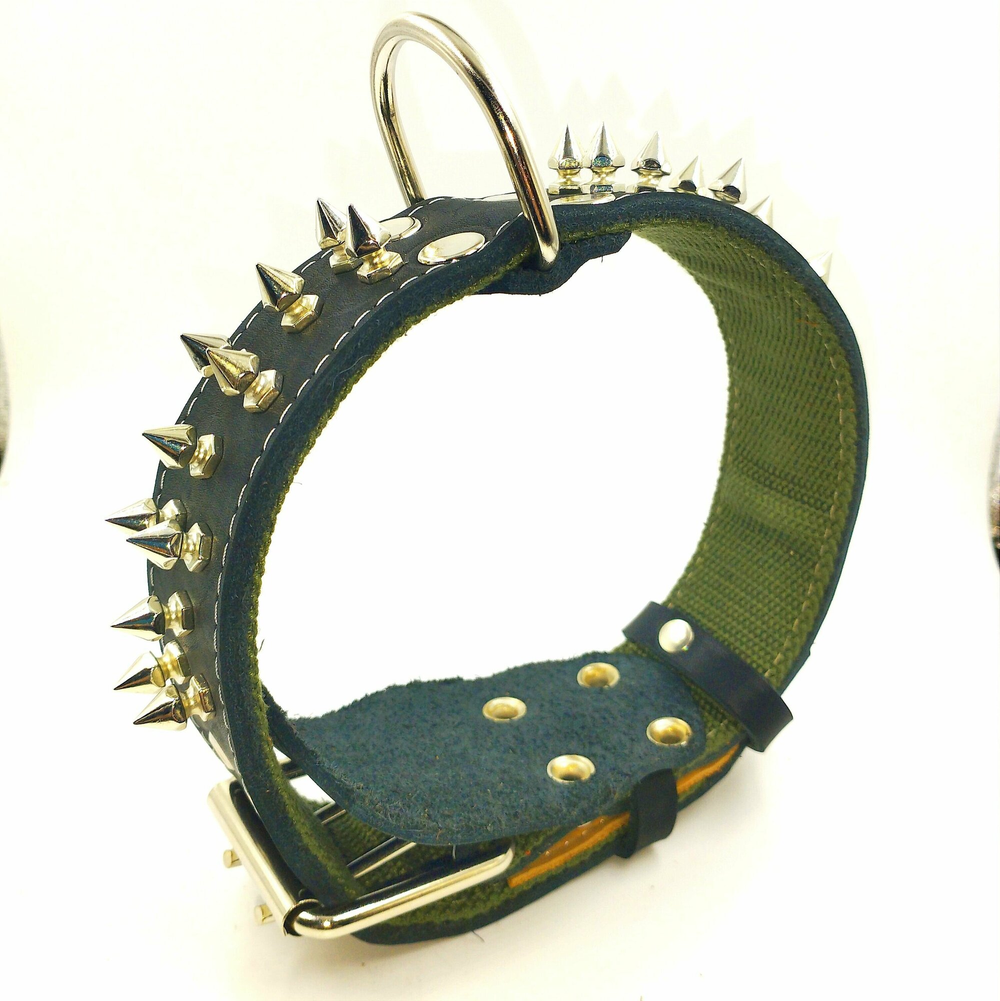 Купить Ошейник для средних пород собак из натуральной кожи и брезента с шипами, ширина 45 мм, длина 66 см, объём шеи 45-57 см.