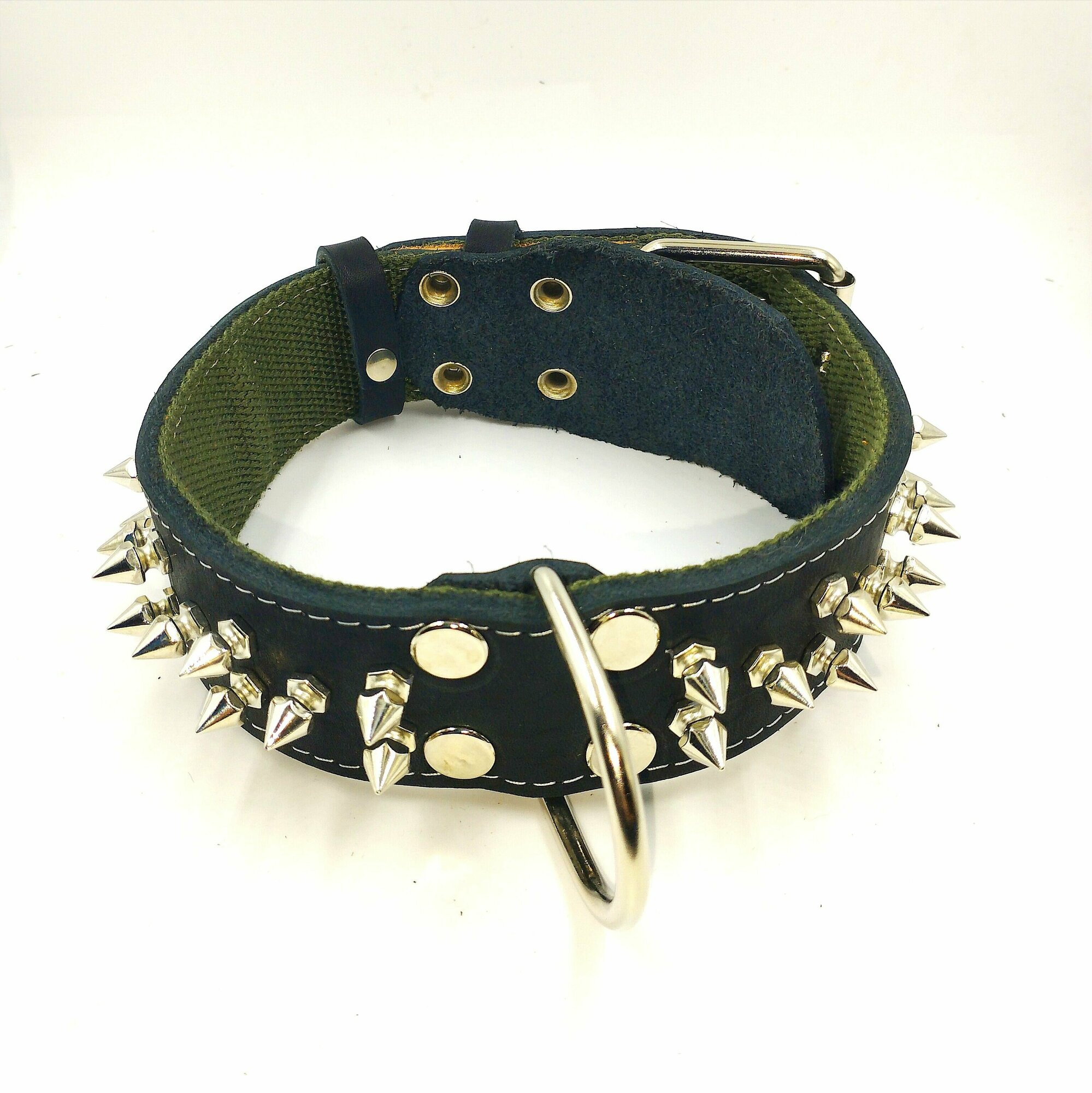 Ошейник из натуральной кожи на брезенте с шипами для собак средних пород. Ширина 25 мм Длина 60 см Объём шеи 41-53 см. Кожаный ошейник с шипами.