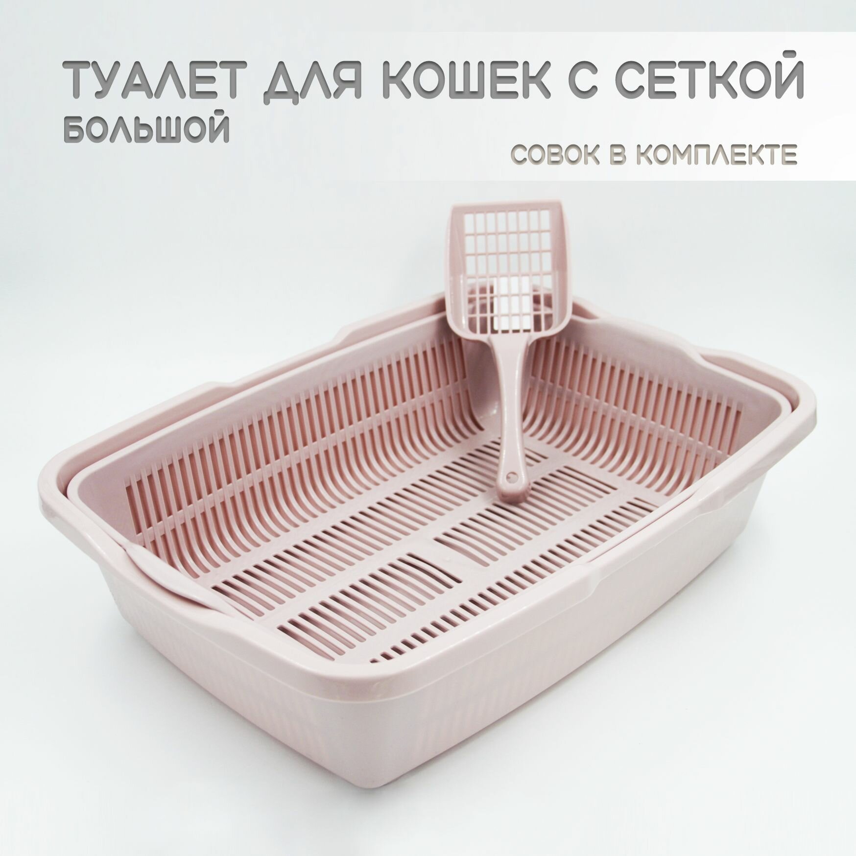 Кошачий туалет для кота с совком и сеткой, большой, пепельно-розовый