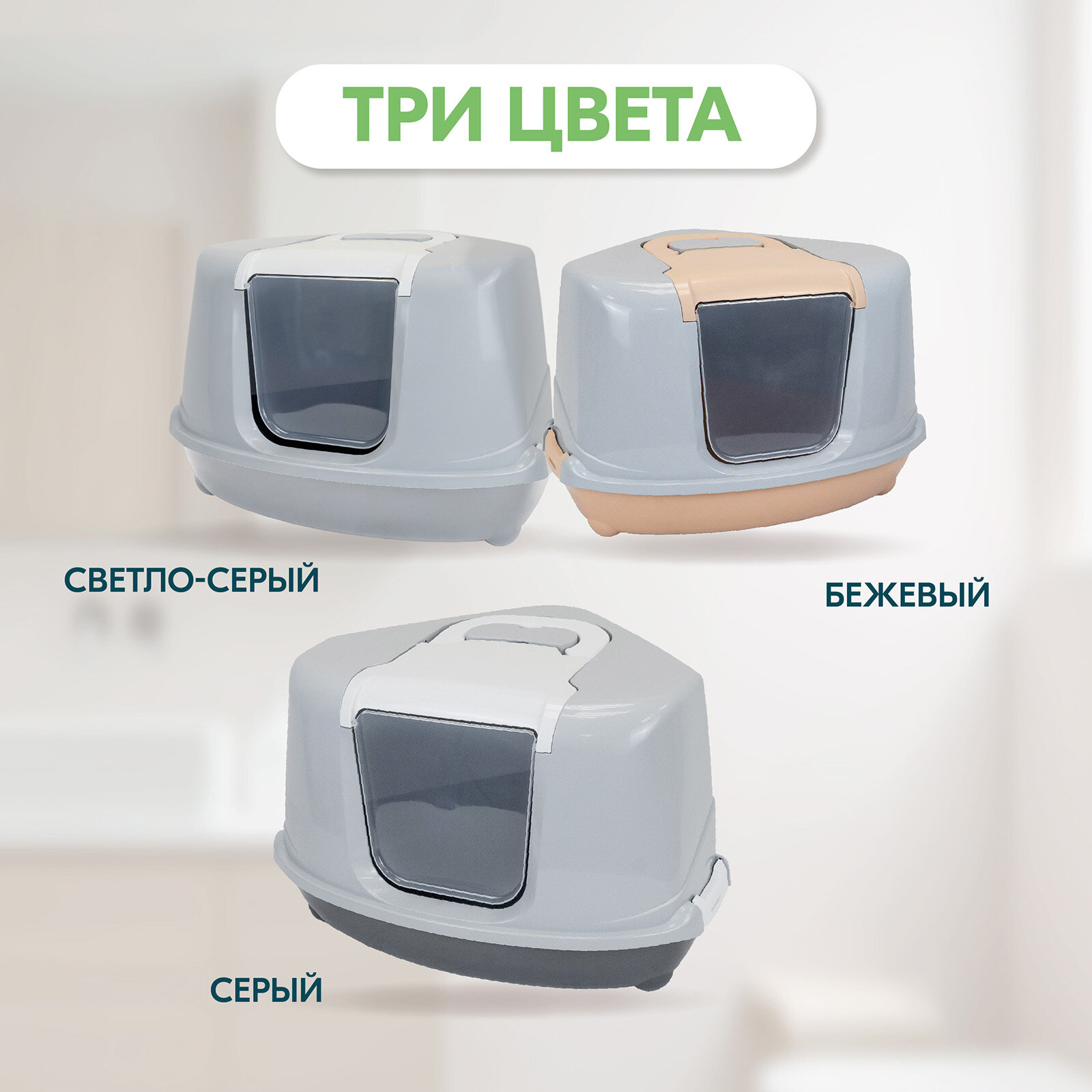Купить Туалет для кошек угловой, лоток закрытый и совок "PetTails" домик с дверцей 57 х 46 х 37 см, бежевый низ/светло-серый верх