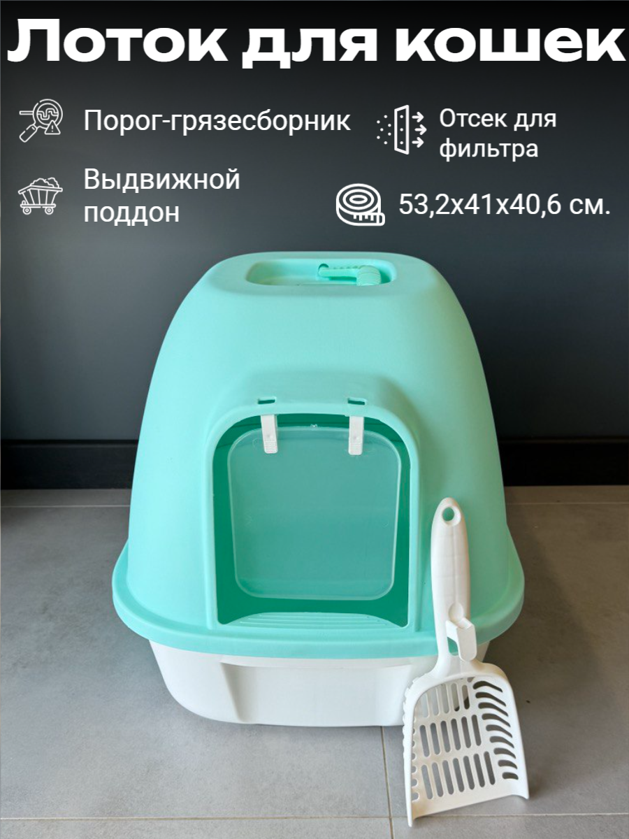 Купить Закрытый лоток для кошек "Чистый Котик" с поддоном и совком,зеленый,пластик 53,2x41x40,6