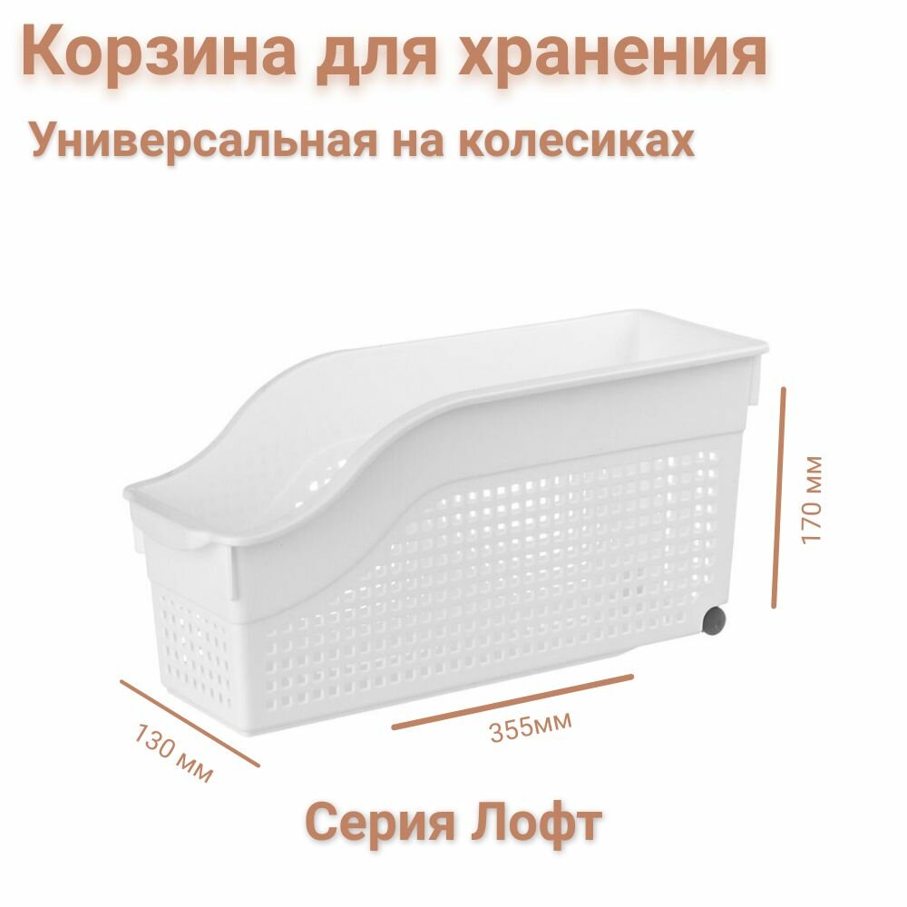 Контейнер для хранения универсальный на колесах узкий, Лофт, 355х130х170мм, пластик, цвет белый