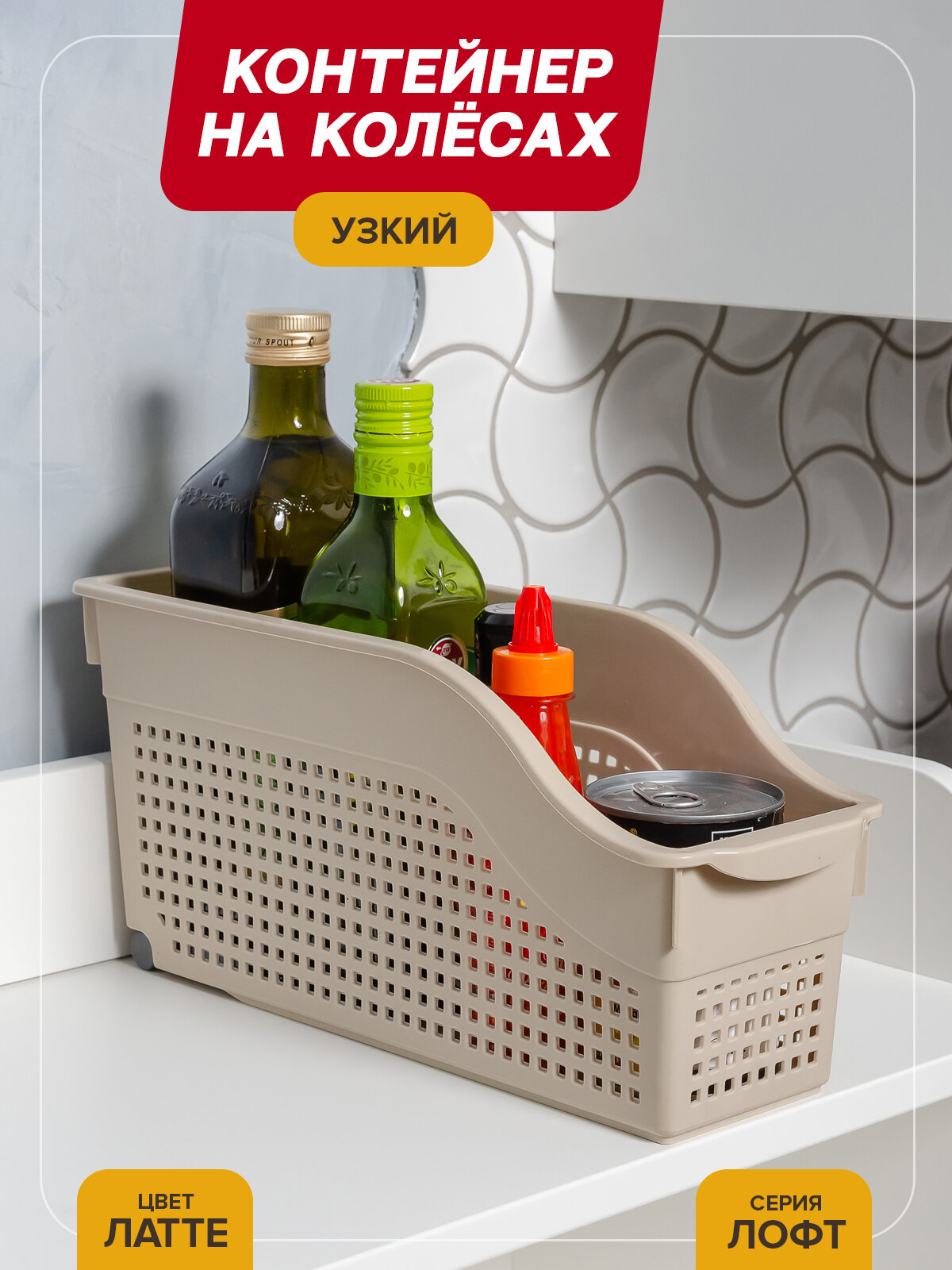 Контейнер для хранения на колесах узкий Лофт, цвет латте / органайзер хозяйственный для кухни, ванной