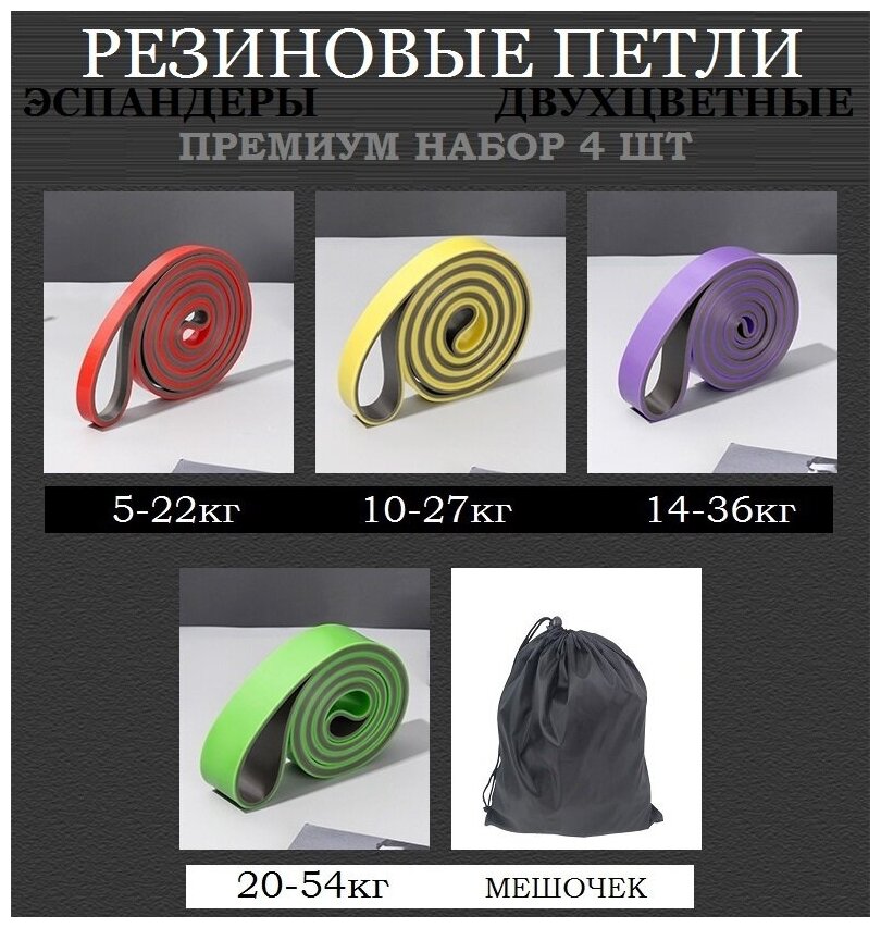 Резиновые петли-эспандеры двухцветные премиум набор 4шт (нагрузка 5-54кг) интересное: