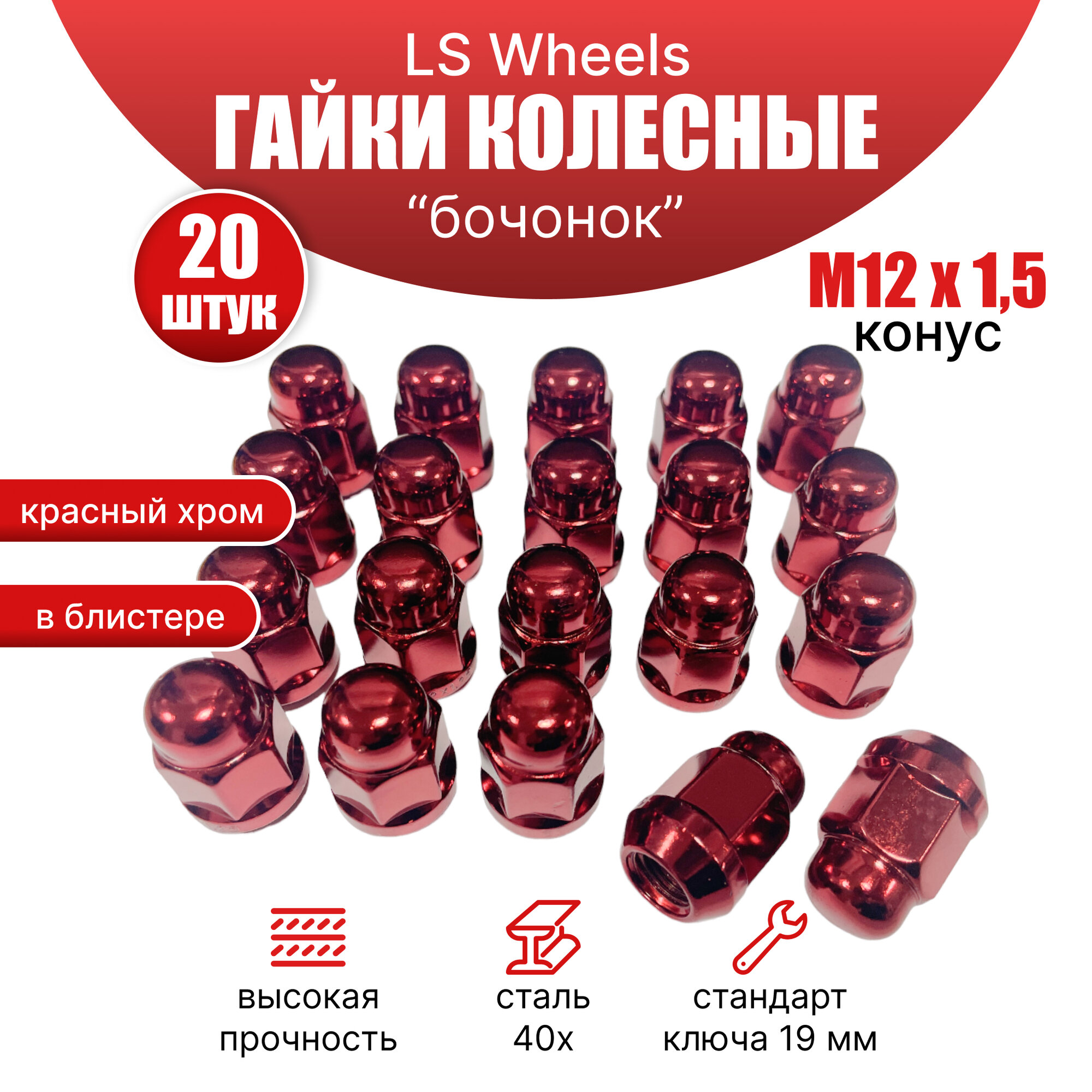 Комплект колесных гаек LS М12х1,5 (конус кл.19) 20 штук, красные