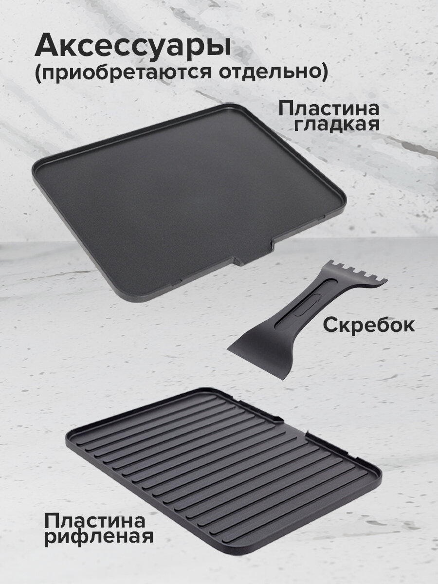 | Особенности | антипригарное покрытие / контактный гриль / поддон для сбора жира / регулировка высоты верхней панели / съемные пластины |