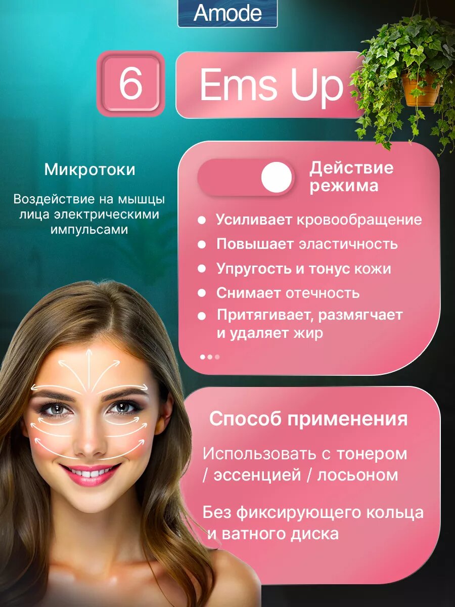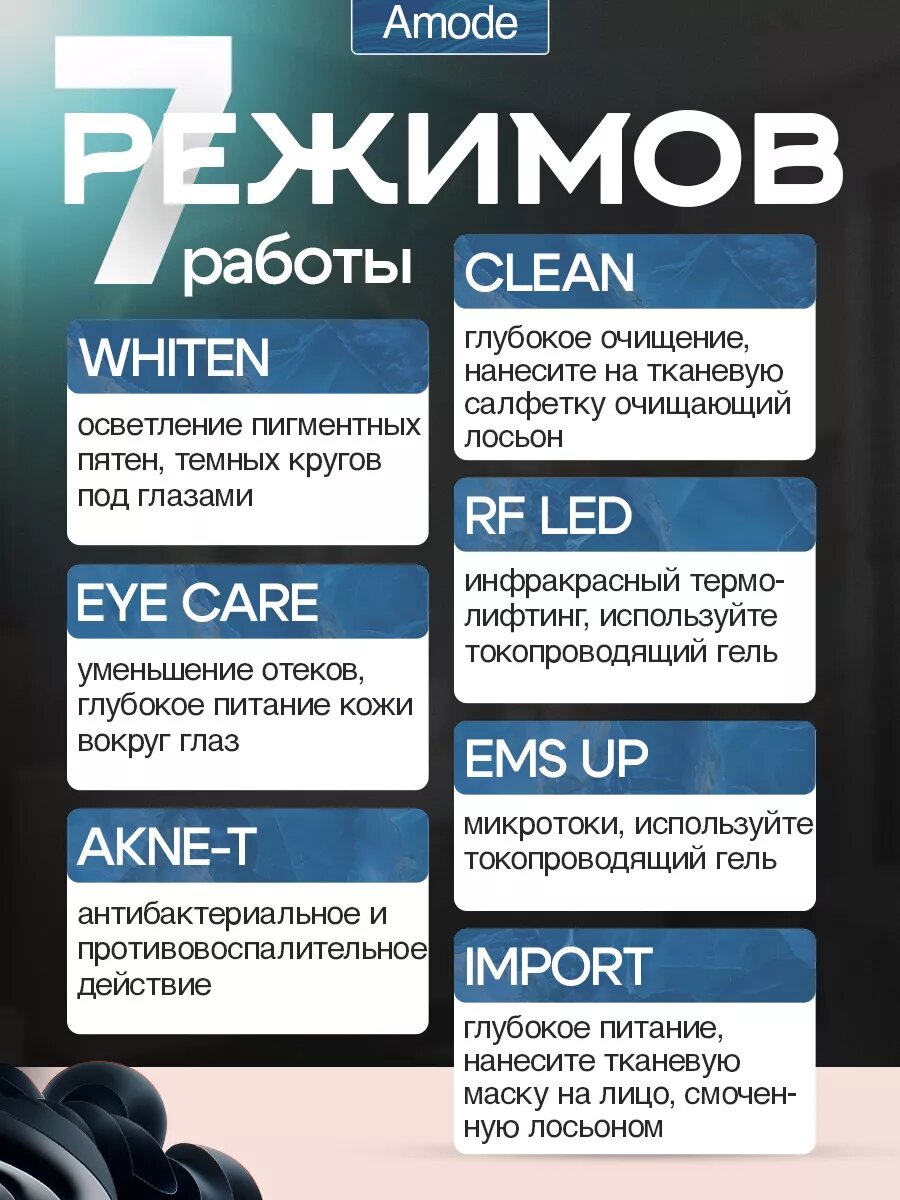 | Принцип работы | RF-лифтинг / вибрация / вращение / инфракрасное излучение / лазерная технология / микротоки / миостимуляция / светотерапия |