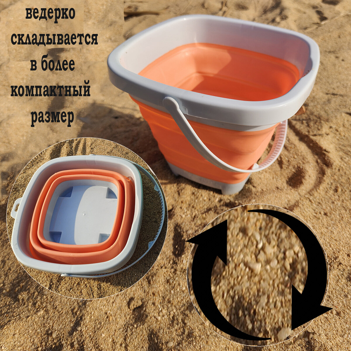 Формочки детские для песка со складным оранжевым ведерком. Набор пляжных игрушек.