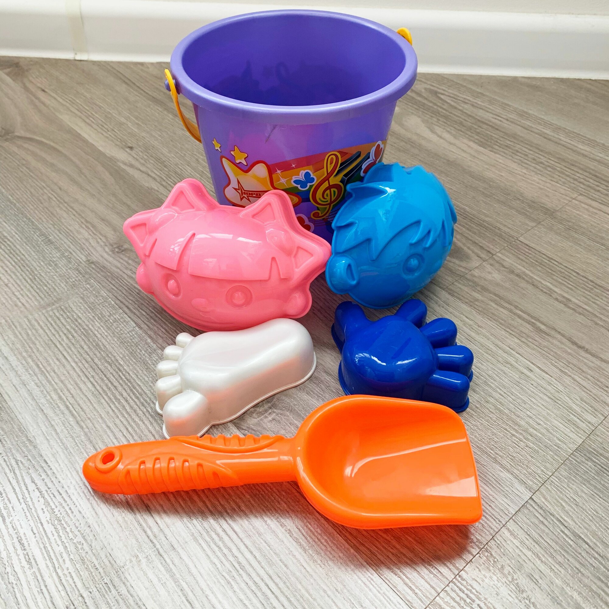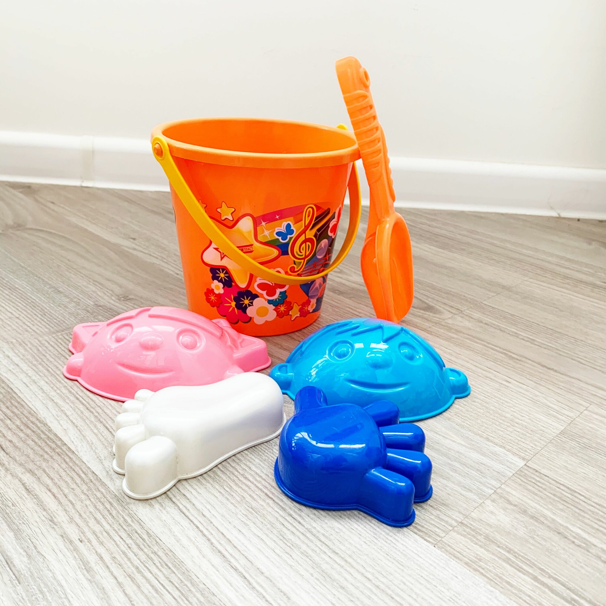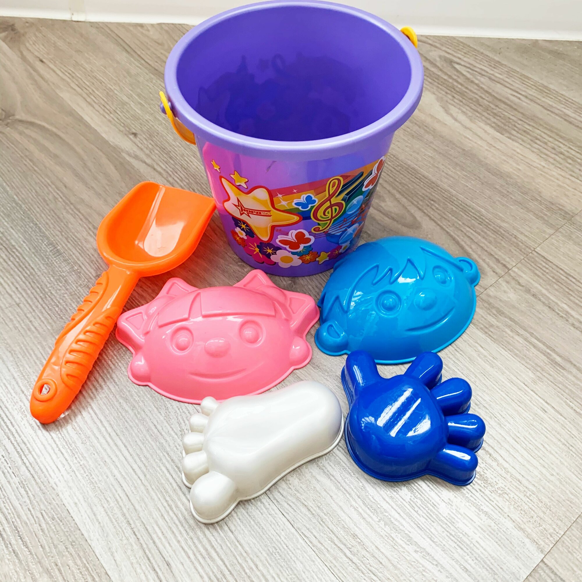 Купить Песочный набор с ведром 2 л., совком и формочками ручка, ножка, лицо девочка+мальчик