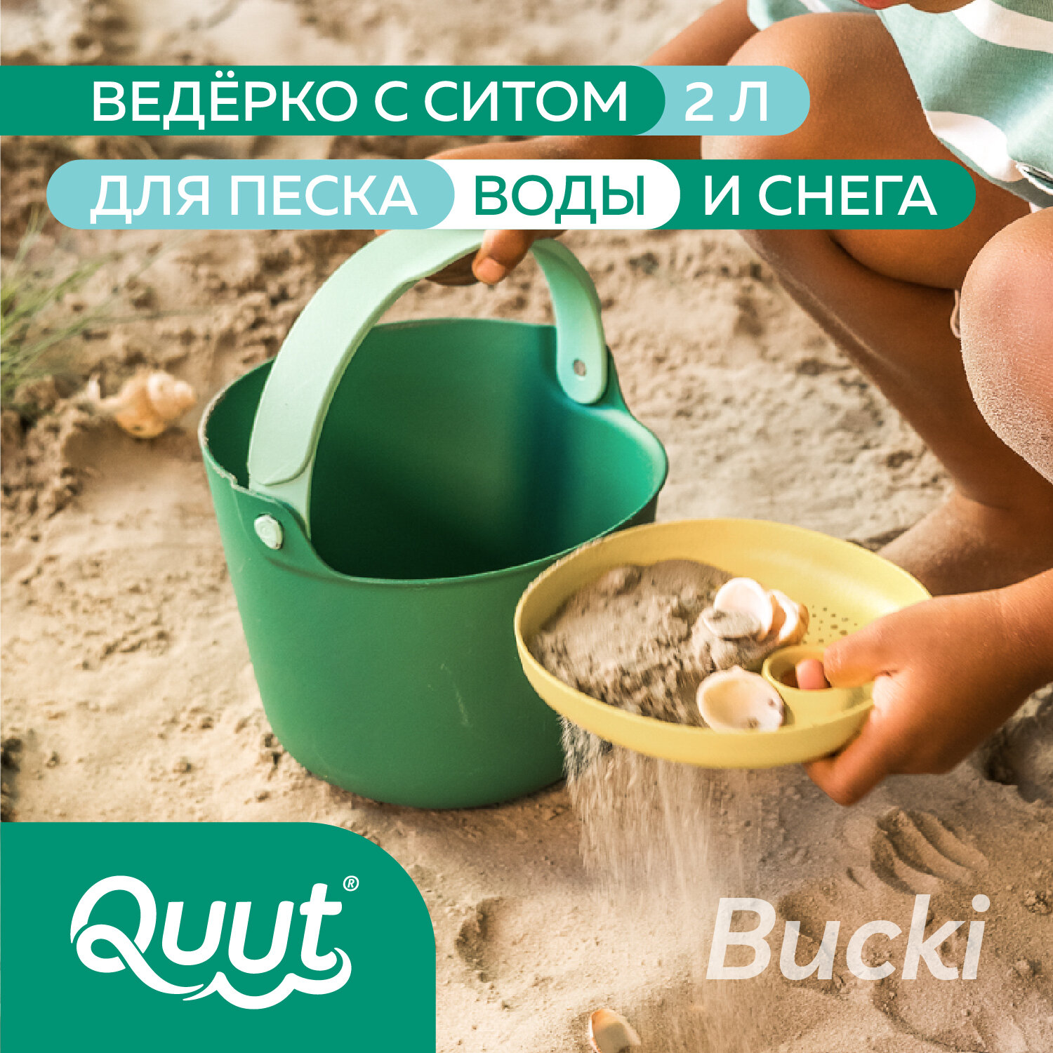 Детское ведерко для воды и песка Quut Bucki с ситом. Цвет: садовый зелёный. Объём: 2 литра интересное: