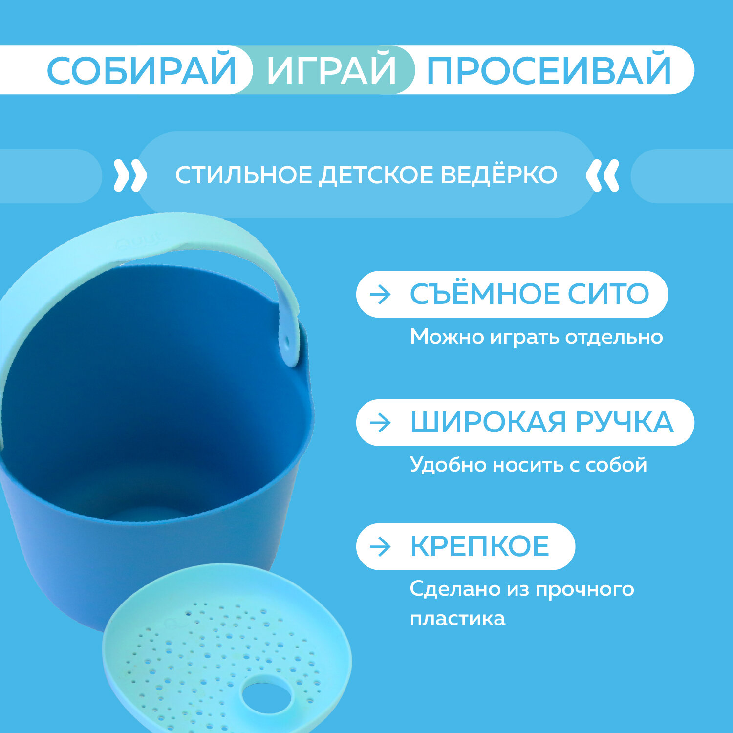 Детское ведерко для воды и песка Quut Bucki с ситом. Цвет: океан. Объём: 2 литра интересное: