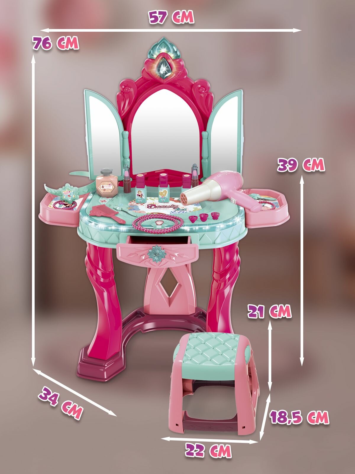 | Комплектация | Детская расческа; игрушечная косметика; Детский стул - 1 шт; 1 туалетный столик; детский фен |