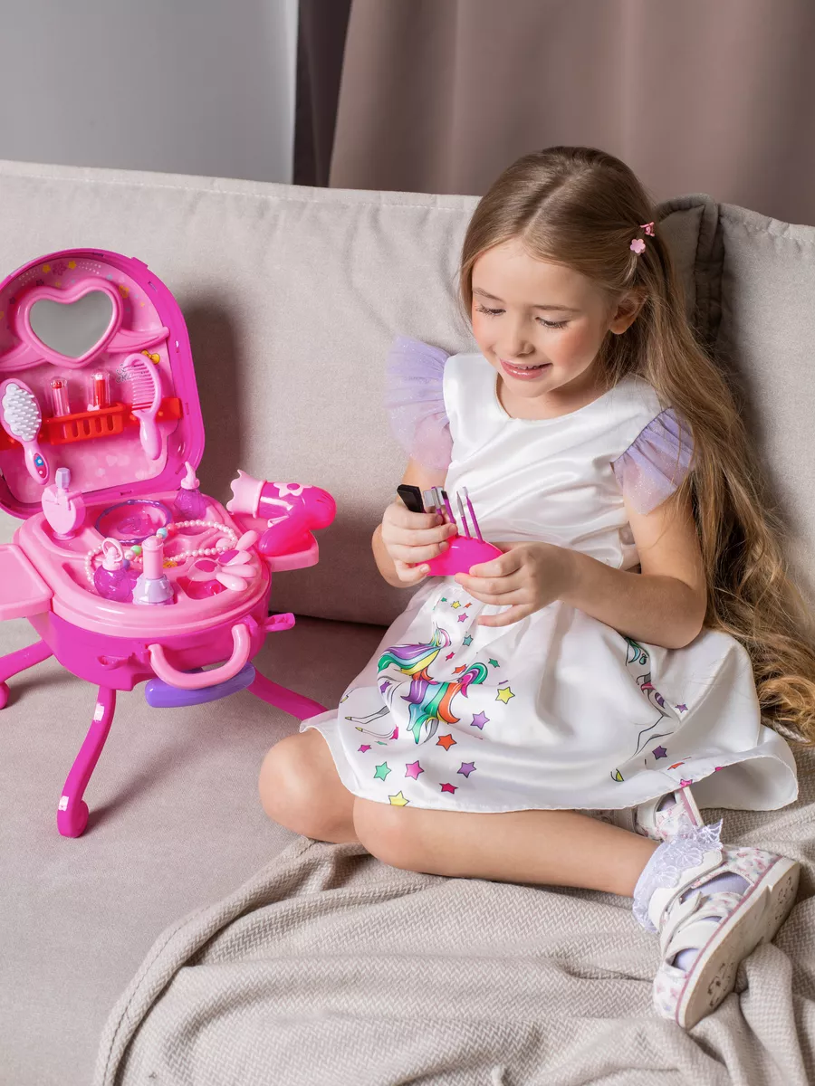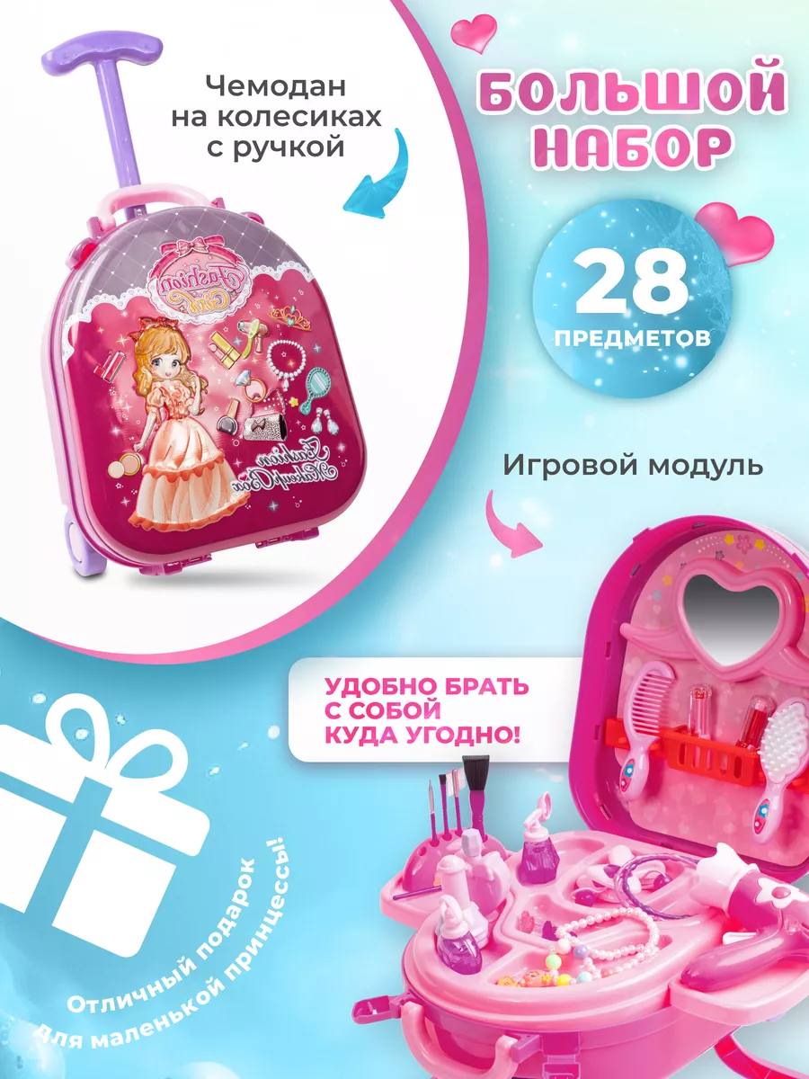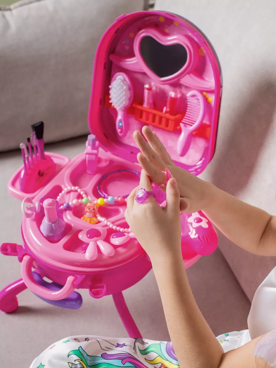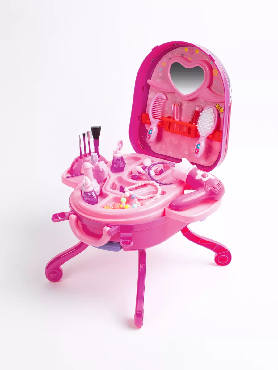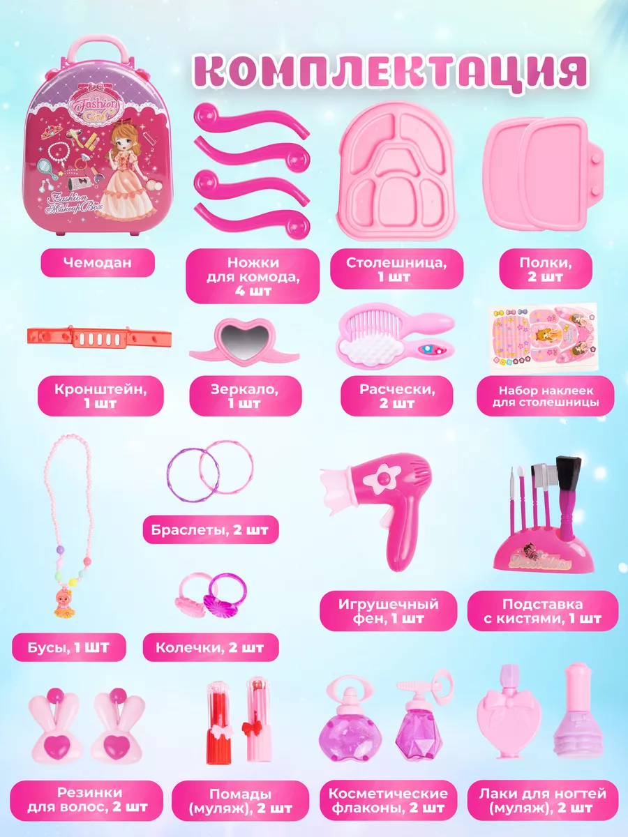 | Комплектация | чемодан / ножки для комода 4 шт / столешница 1 шт / полки 2 шт / кронштейн 1 шт / зеркало 1 шт / расчески 2 шт / набор наклеек для столешницы / бусы 2 шт / браслеты 2 шт / колечки 2 шт / игрушечный фен 1 шт / подставка с кистями 1 шт / резинки для волос 2 шт / помада-муляж 2 шт / косметические флаконы 2 шт / лаки для ногтей муляж 2 шт |
