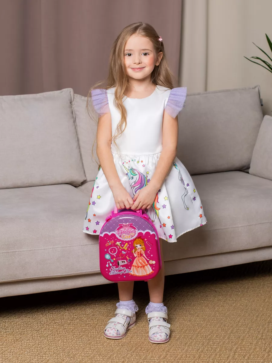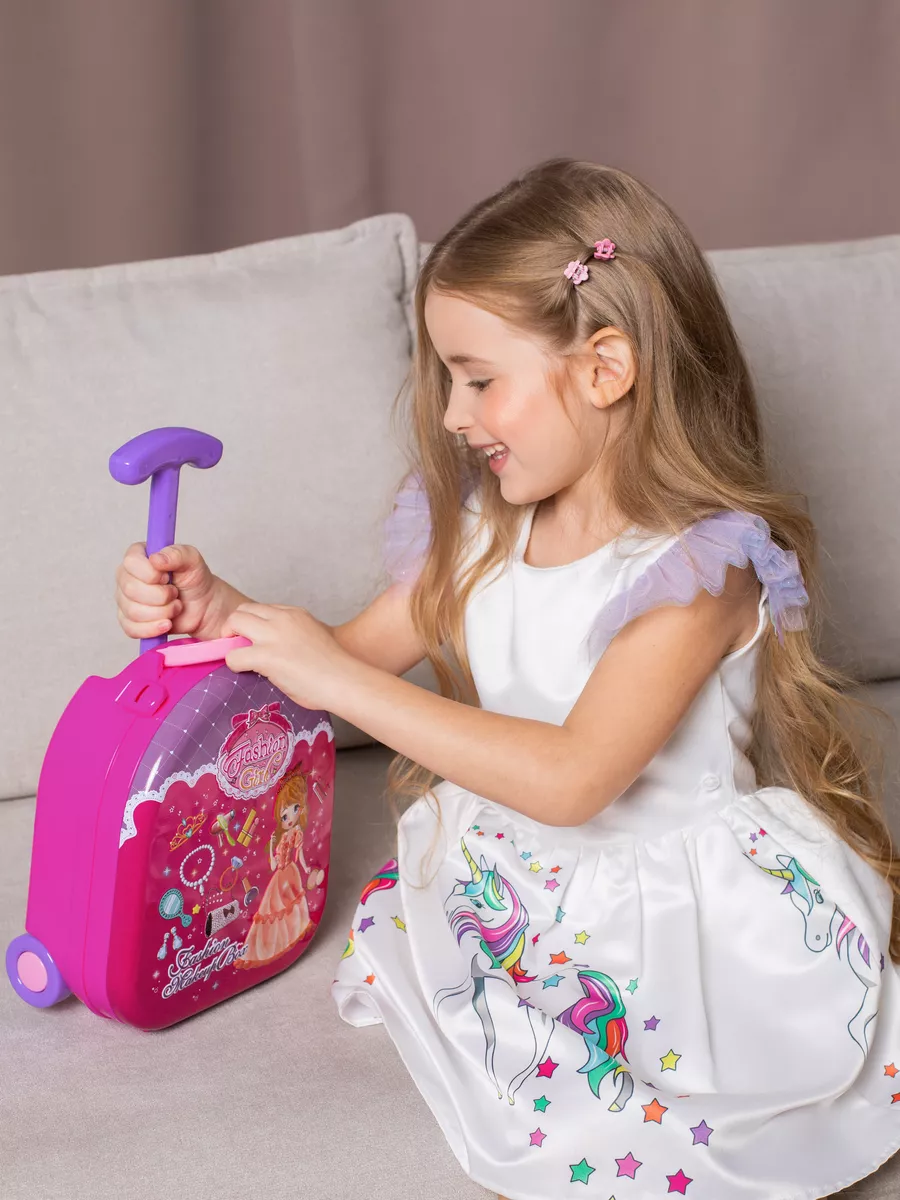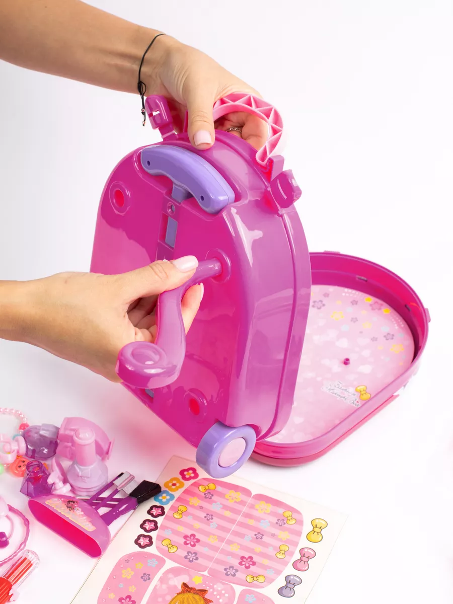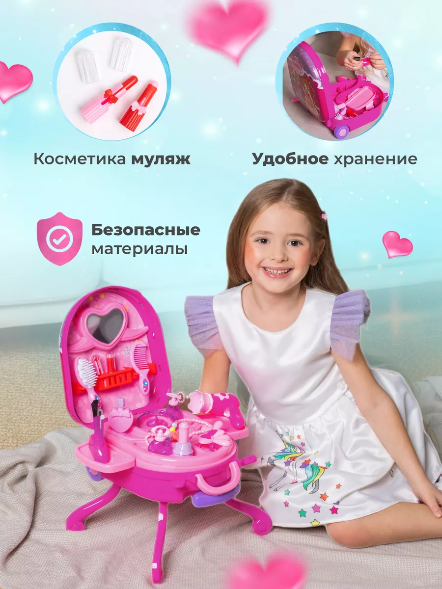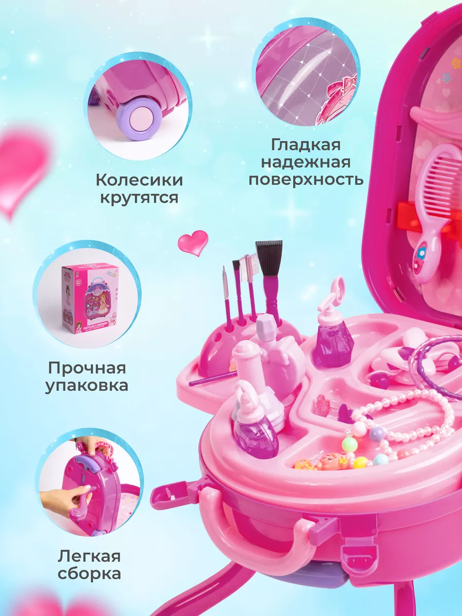 | Комплектация | чемодан / ножки для комода 4 шт / столешница 1 шт / полки 2 шт / кронштейн 1 шт / зеркало 1 шт / расчески 2 шт / набор наклеек для столешницы / бусы 2 шт / браслеты 2 шт / колечки 2 шт / игрушечный фен 1 шт / подставка с кистями 1 шт / резинки для волос 2 шт / помада-муляж 2 шт / косметические флаконы 2 шт / лаки для ногтей муляж 2 шт |