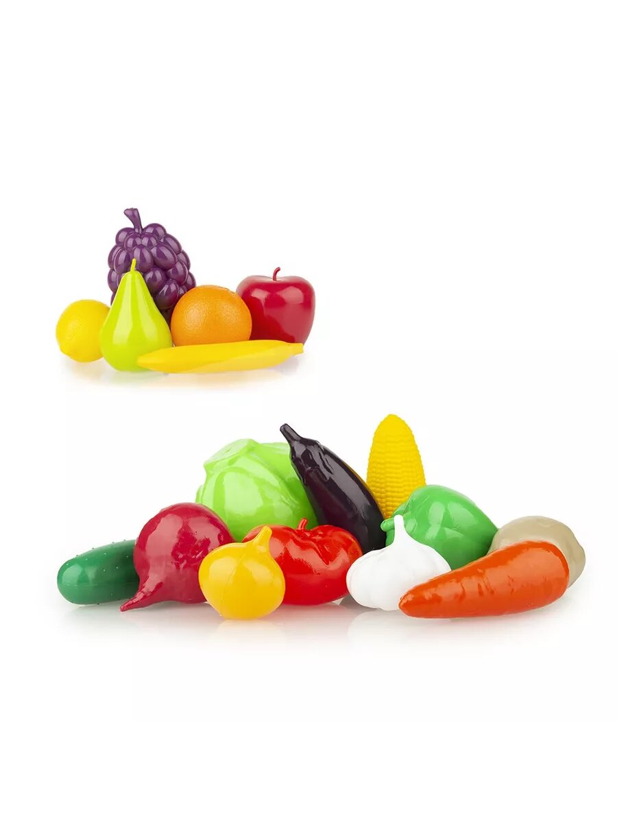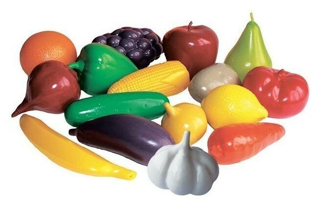 | Комплектация | - виноград (8,5х6,5х15 см.), - лимон (5,5х6х8 см.), - апельсин (7,5х7,5х8 см.), - банан (3х3х17 см.), - груша (7х8х10 см.), - яблоко (8х8х8,5 см.), - огурец (4х4х13 см.), - перец (7х7,5х9 см.), - морковь (4,5х4,5х12 см.), - свекла (6,5х7х9 см.), - кукуруза (4,7х4,7х12 см.), - картофель (5,5х5,5х8 см.), - баклажан (4,5х4,5х13 см.), - помидор (8,5х7,5х6 см.), - капуста (10,5х11х11 см.), - лук (5,5х5,5х6 см.), - чеснок (7х7х6 см.). |