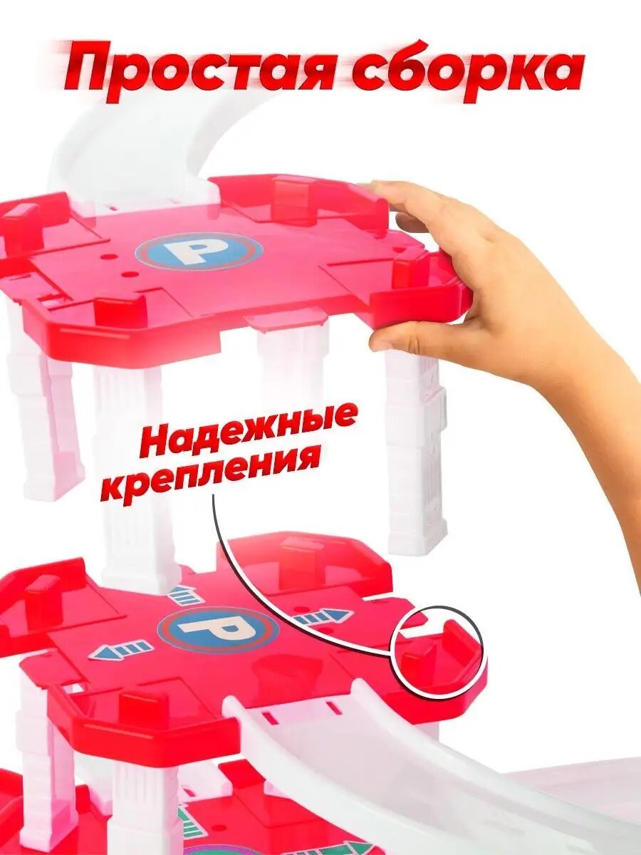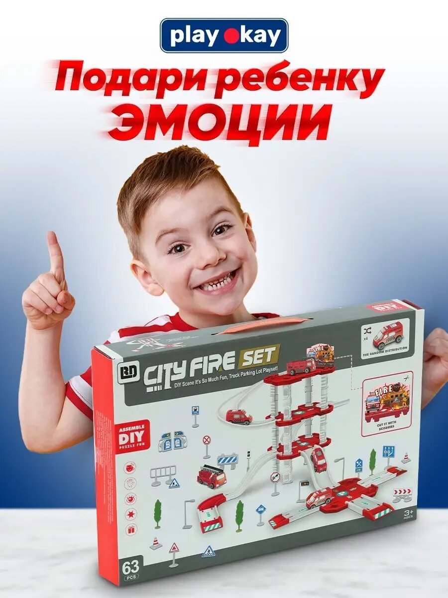 Парковка для машинок многоуровневая Play Okay Parking Fire, гараж детский с горкой и наклейками + дорожные знаки, Конструктор для мальчиков (игровой набор пожарной техники Паркинг) / 63 детали