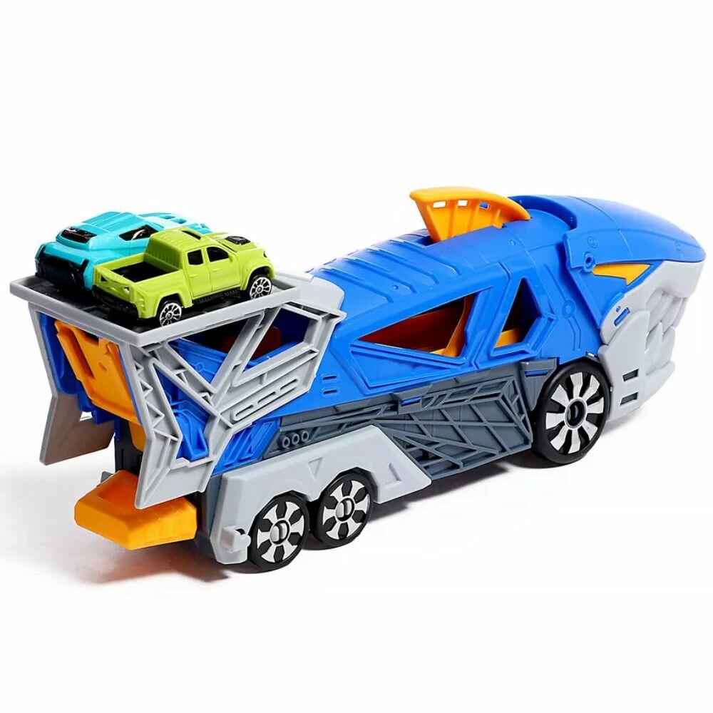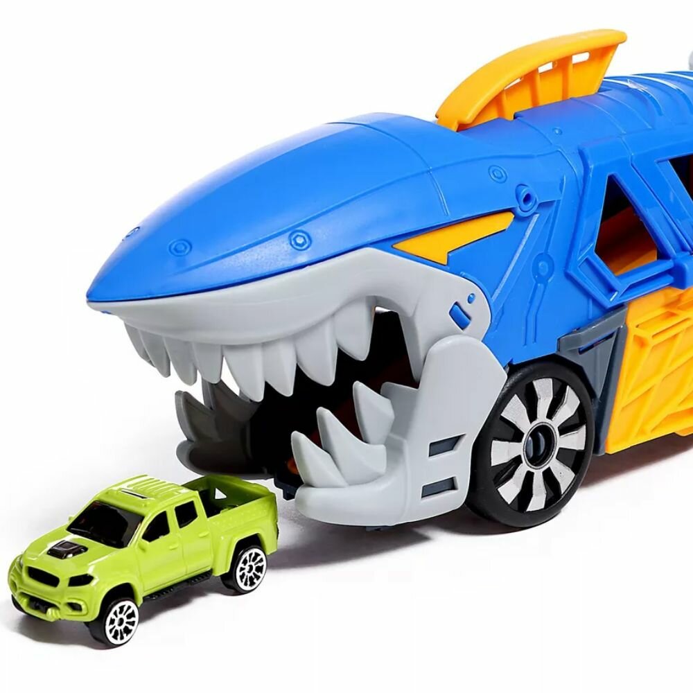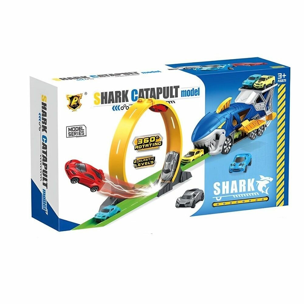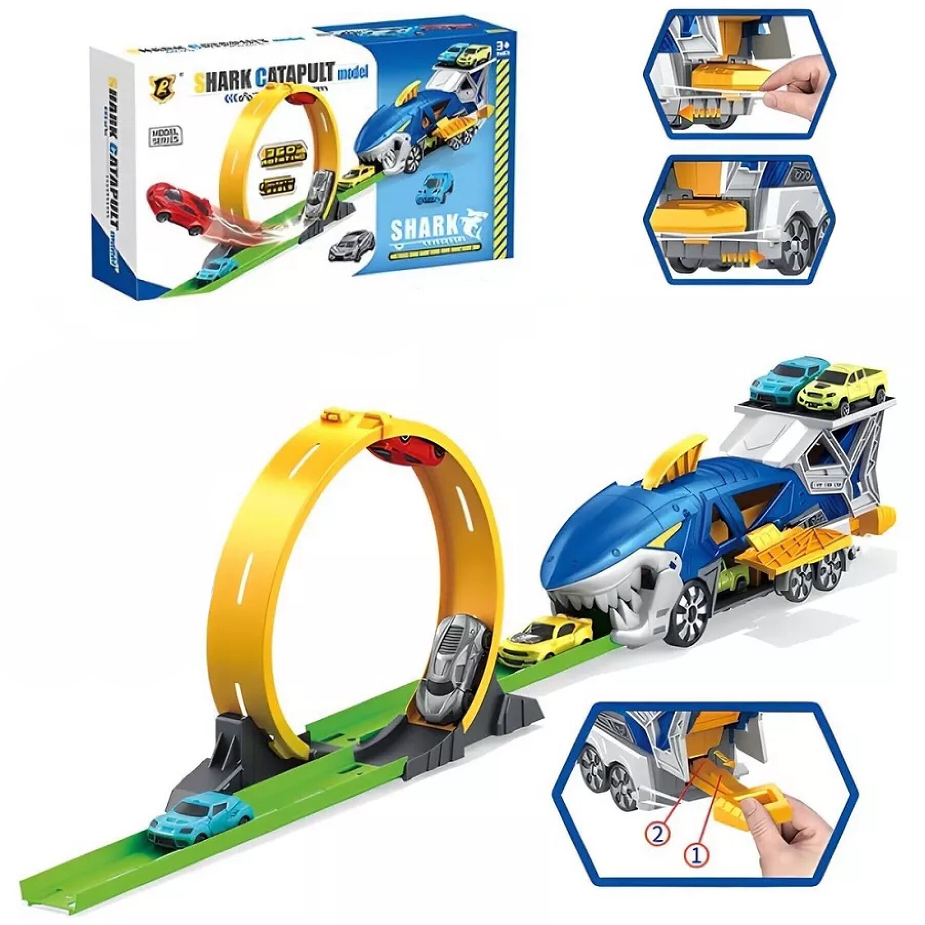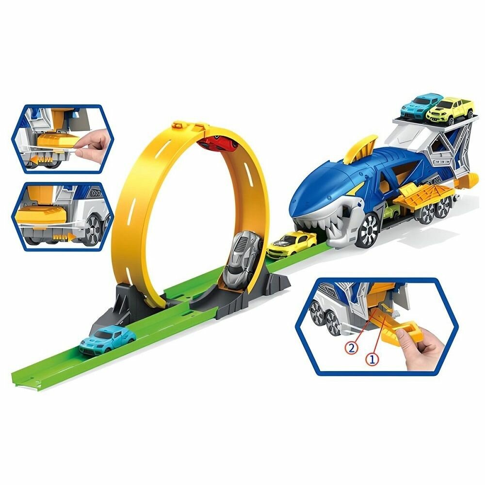 Купить Детский гоночный автотрек с 6 машинками и автовозом Акула, 2 скорости запуска машинок