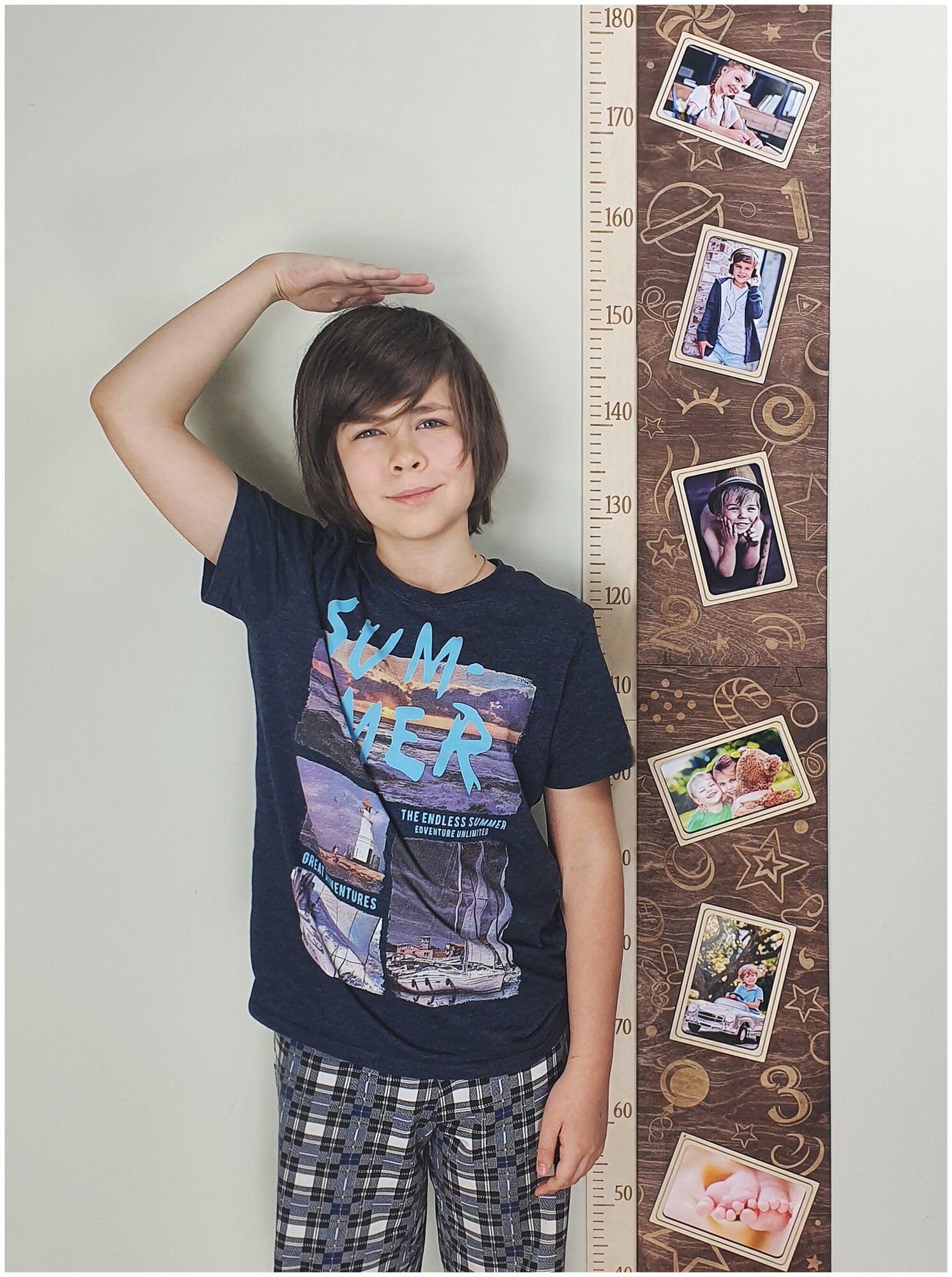 Ростомер Woodenking с фото-рамками. Деревянная ростовая линейка на стену.