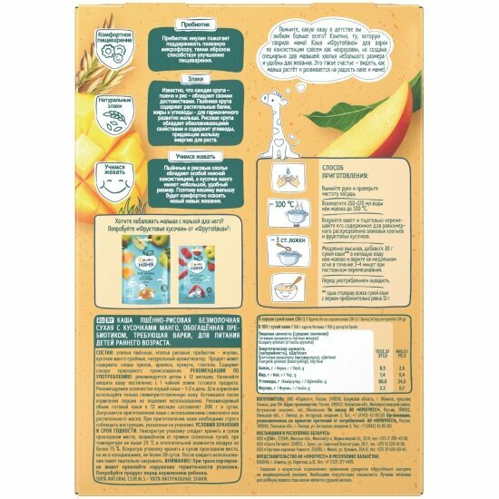 Ниже Вы можете прочитать отзывы на Каша Фрутоняня пшённо-рисовая безмолочная для варки с кусочками манго с 12 мес 200 г, ознакомится с подробными характеристиками, посмотреть интересные обзоры и фотографии на Каша Фрутоняня пшённо-рисовая безмолочная для варки с кусочками манго с 12 мес 200 г.