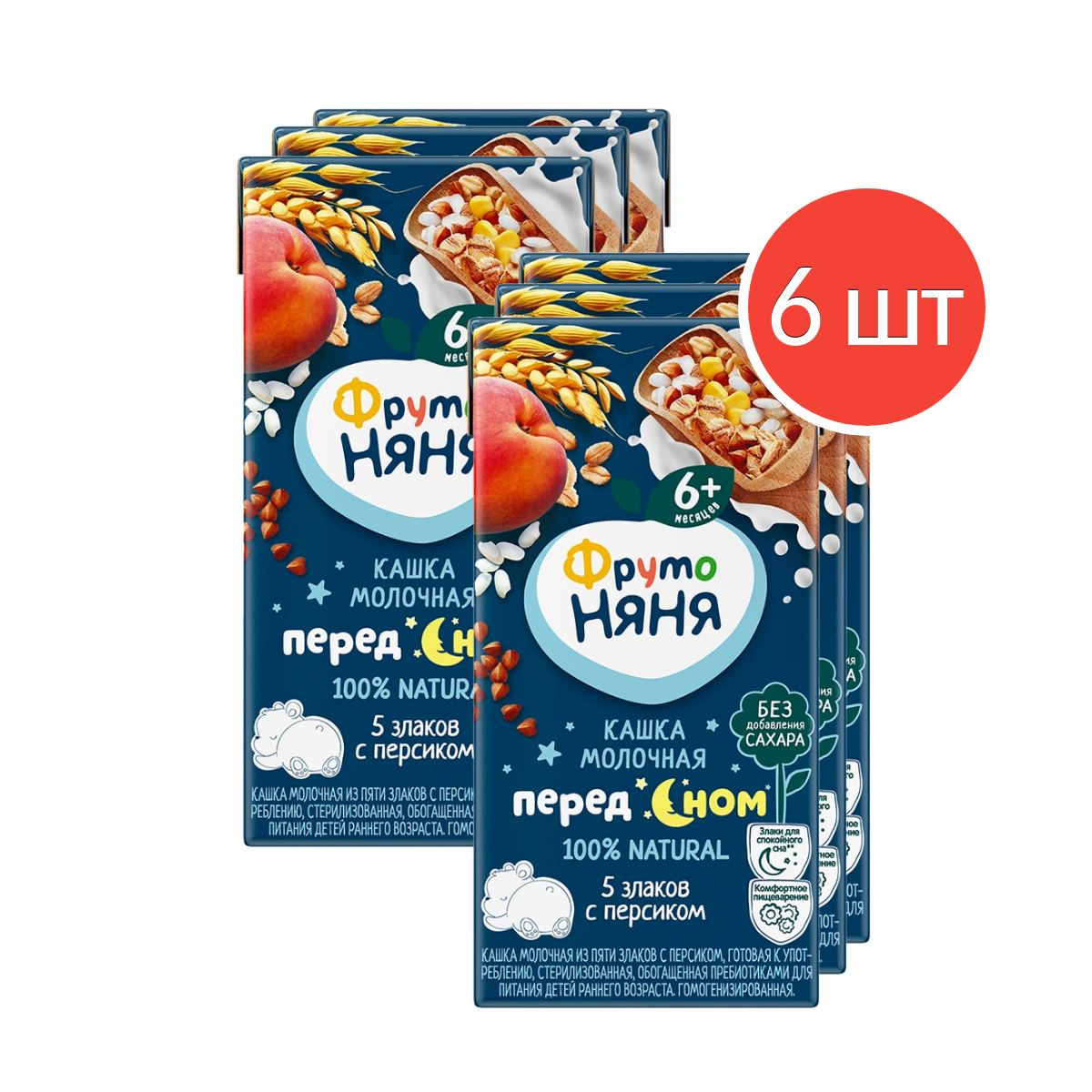 | Состав | Молоко сухое цельное, концентрированный яблочный сок, пюре персиковое, мальтодекстрин, мука рисовая, мука кукурузная, мука пшеничная, мука гречневая, мука овсяная, пребиотик-инулин, ароматизатор натуральный Персик, вода. |