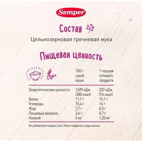Каша безмолочная Semper гречневая с 4 мес 180 г интересное: