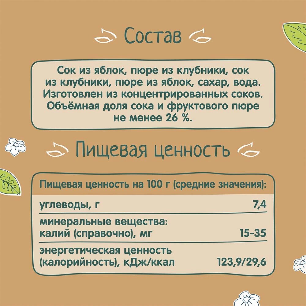 | Состав | Сок из яблок, пюре из клубники, сок из клубники, пюре из яблок, сахар, вода. Изготовлен из концентрированных соков. |
