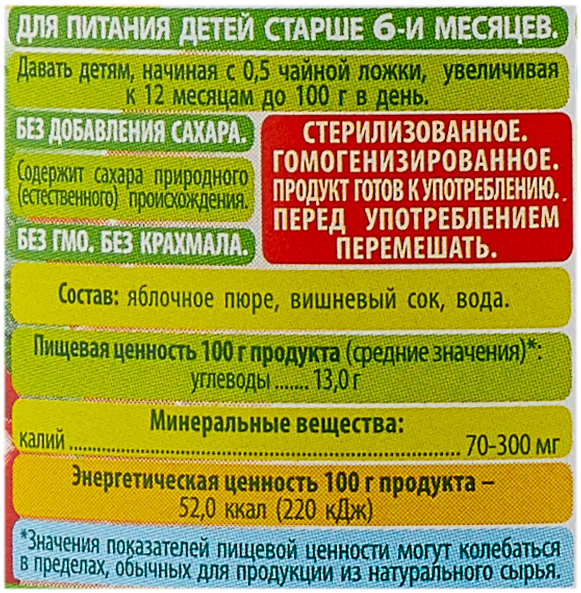 | Состав | Яблочное пюре, вишневый сок, вода. |