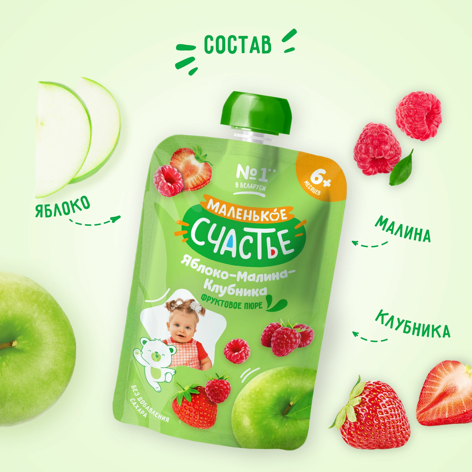 | Состав | пюре яблочное, пюре малиновое, пюре клубничное |