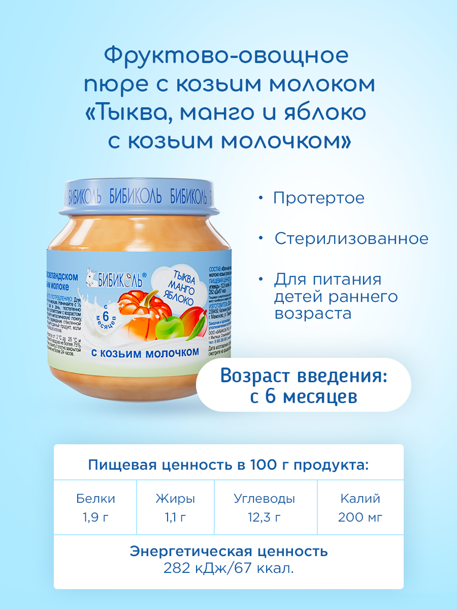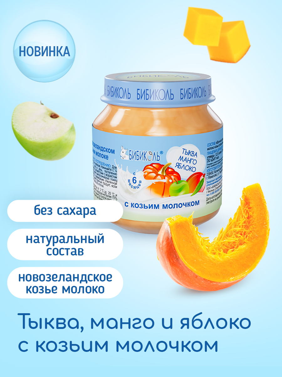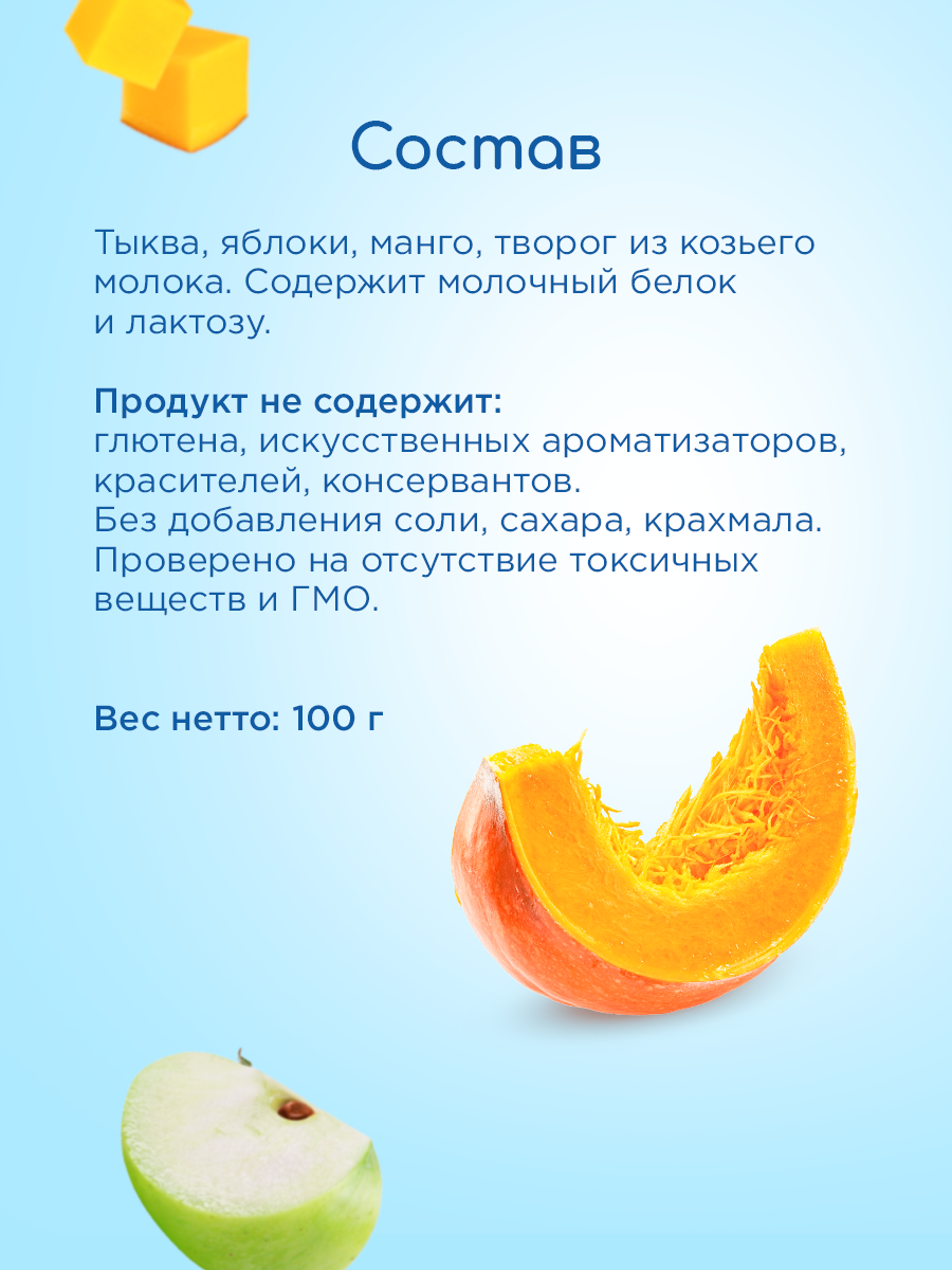| Состав | тыква, яблоки, манго, творог из козьего молока. Содержит молочный белок и лактозу. |