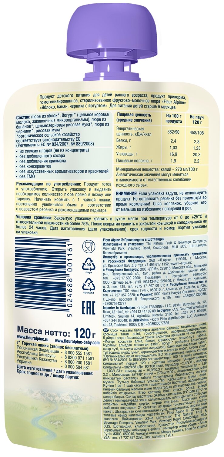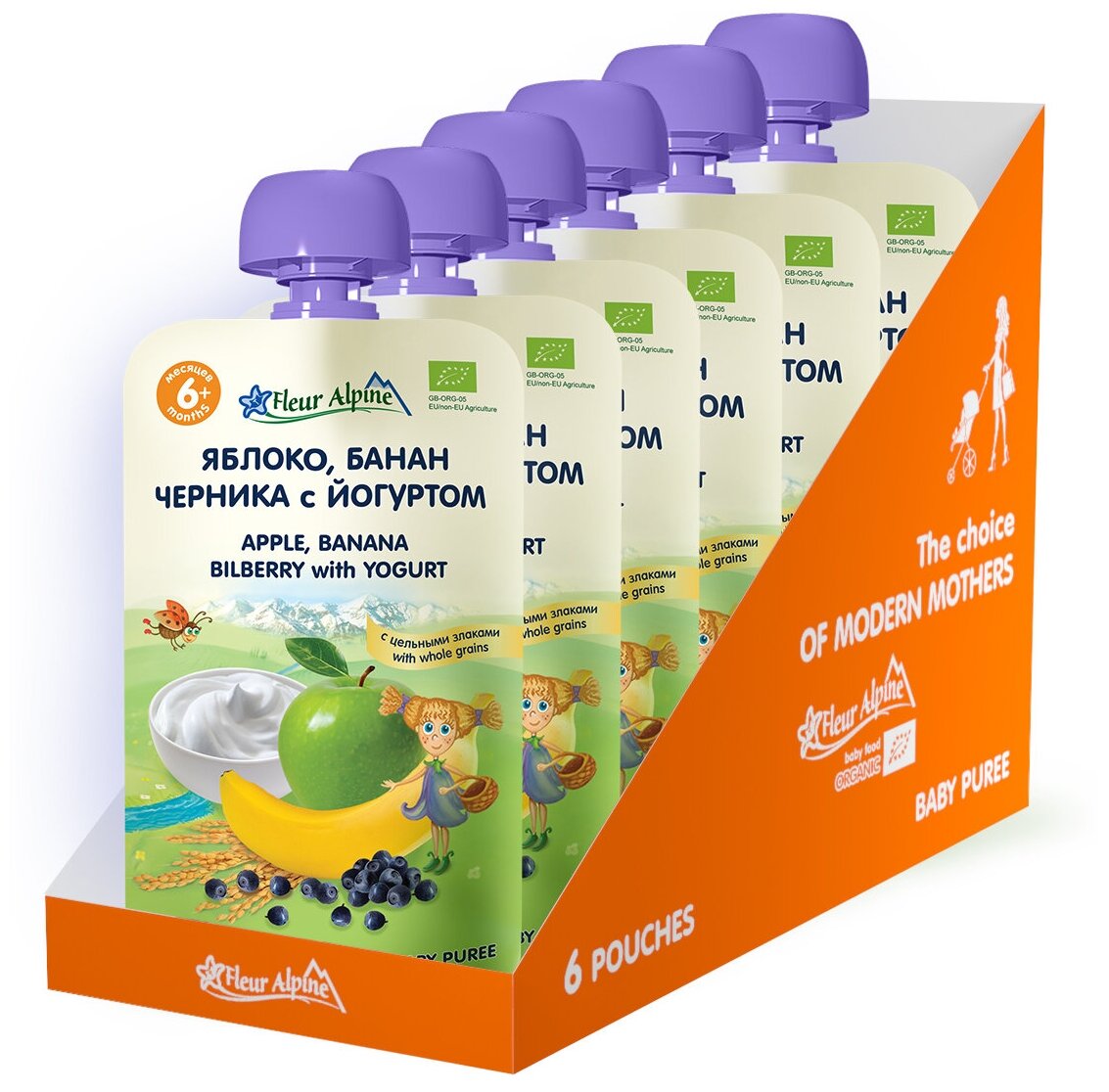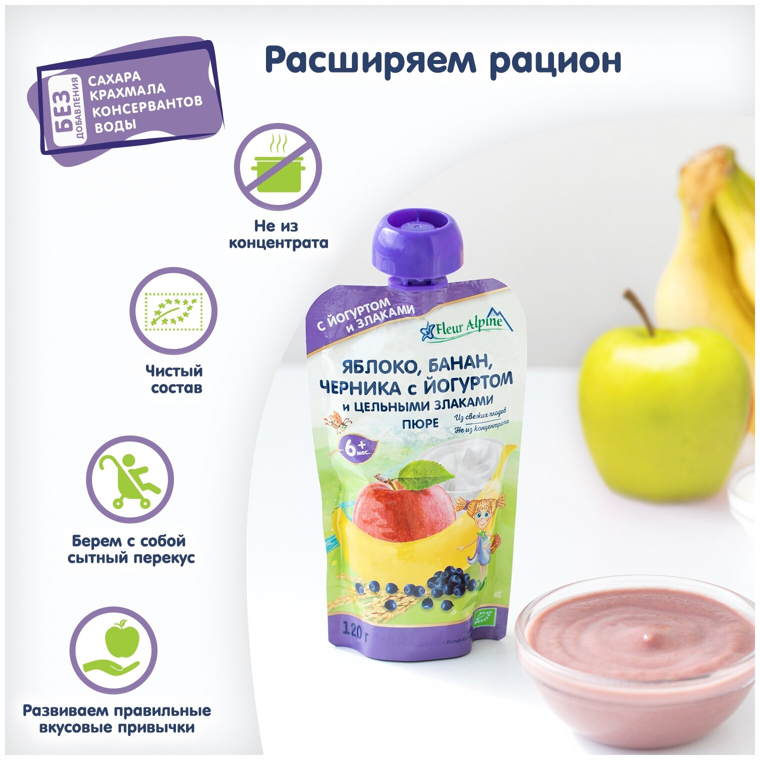 Купить Пюре детское Fleur Alpine яблоко, банан, черника с йогуртом и цельными злаками, с 6 месяцев, 120 г (6 штук)