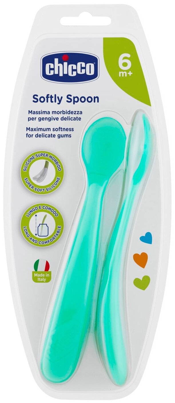 Купить Ложка мягкая, силиконовая, 6+ (голубая) (2шт) Chicco,Кухонные принадлежности,Голубой
