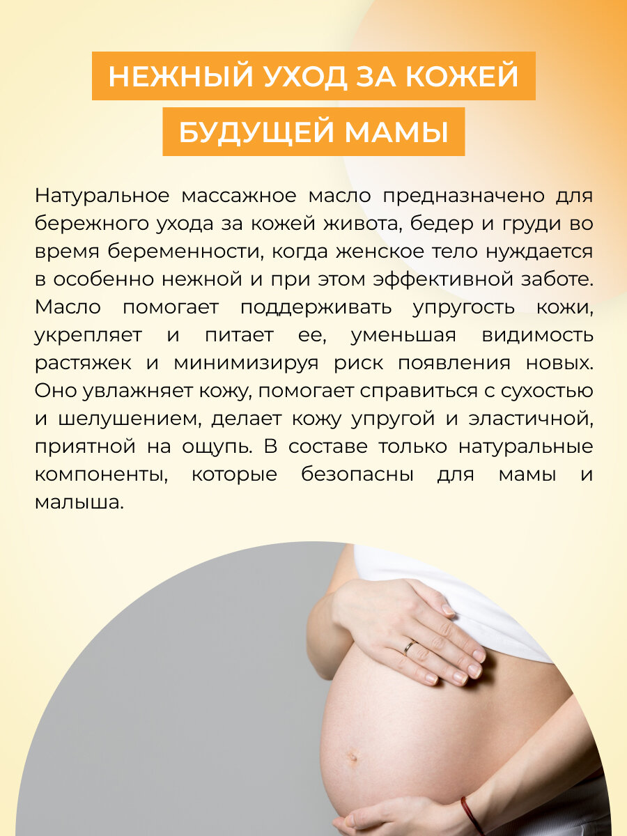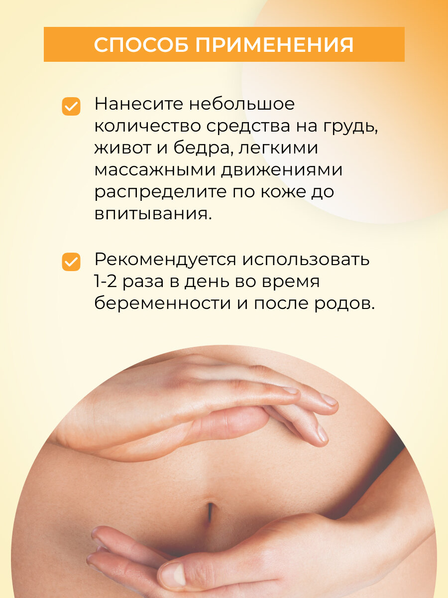 | Способ применения | Нанесите небольшое количество масла на грудь, живот и бедра, легкими круговыми движениями распределите по коже до впитывания. Рекомендуется использовать 1-2 раза в день во время беременности и после родов. |