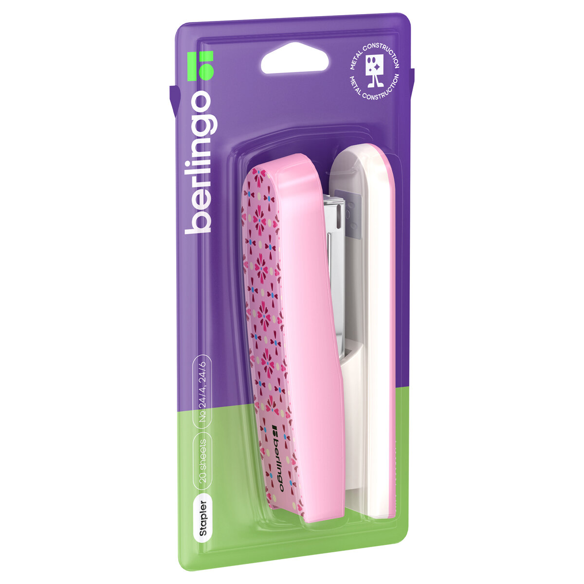 Степлер №24/6, 26/6 Berlingo "Silk Touch", до 20л, пластиковый корпус, розовый