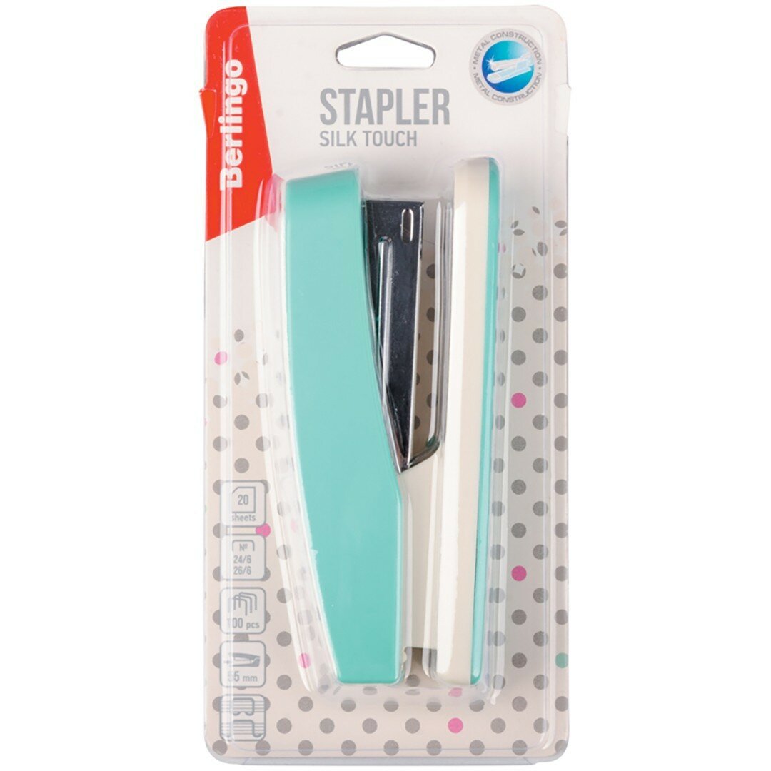 Купить Степлер №24/6, 26/6 Berlingo "Silk Touch", до 20л., пластиковый корпус, мятный