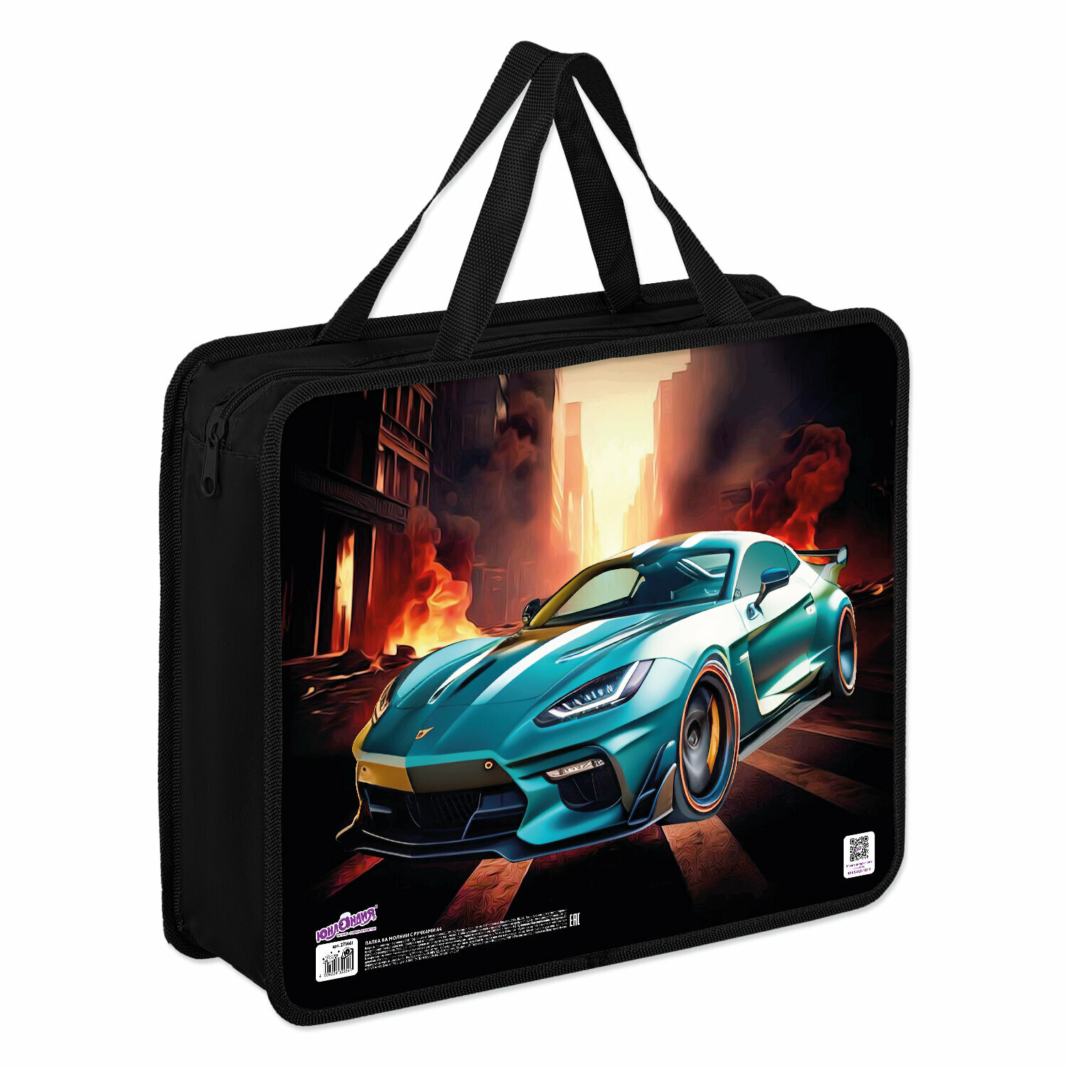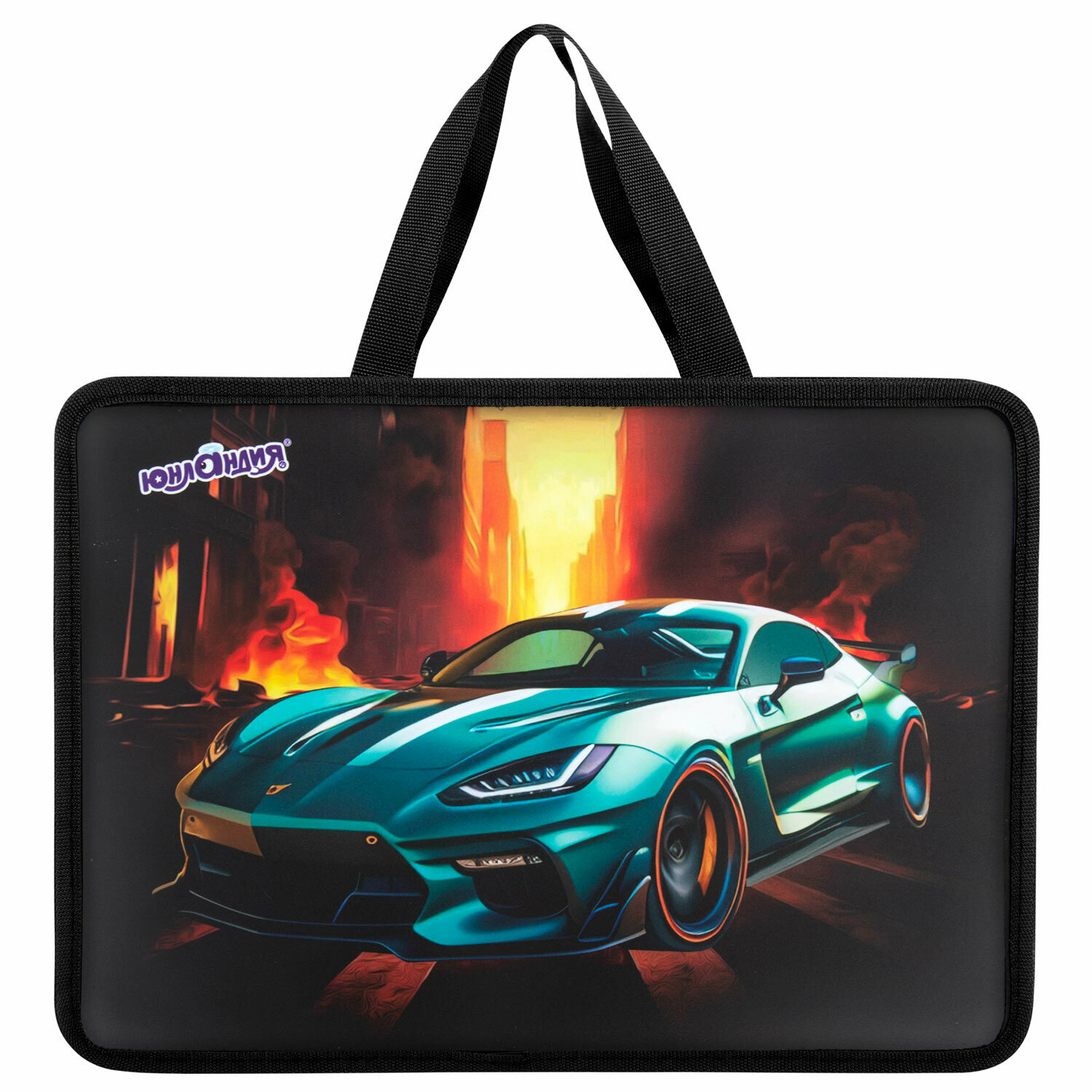Папка на молнии с ручками Юнландия А4, 1 отделение, пластик, 80 мм, Fire car, 272155